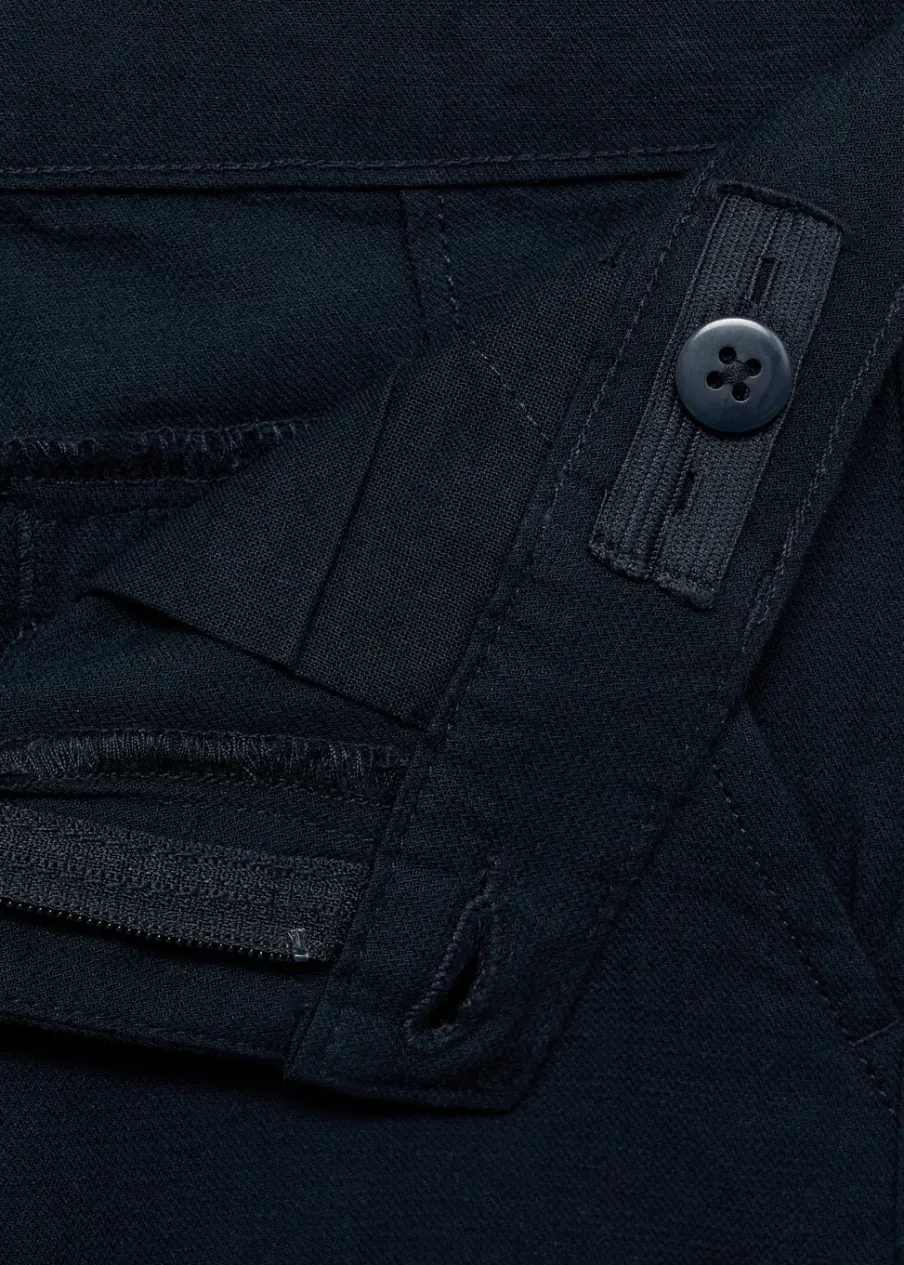 Krój: chinosy. Dwie kieszenie z przodu. Dwie wpuszczane kieszenie z tyłu. Patka z guzikiem w pasie. Talia: regulowana/gumka.