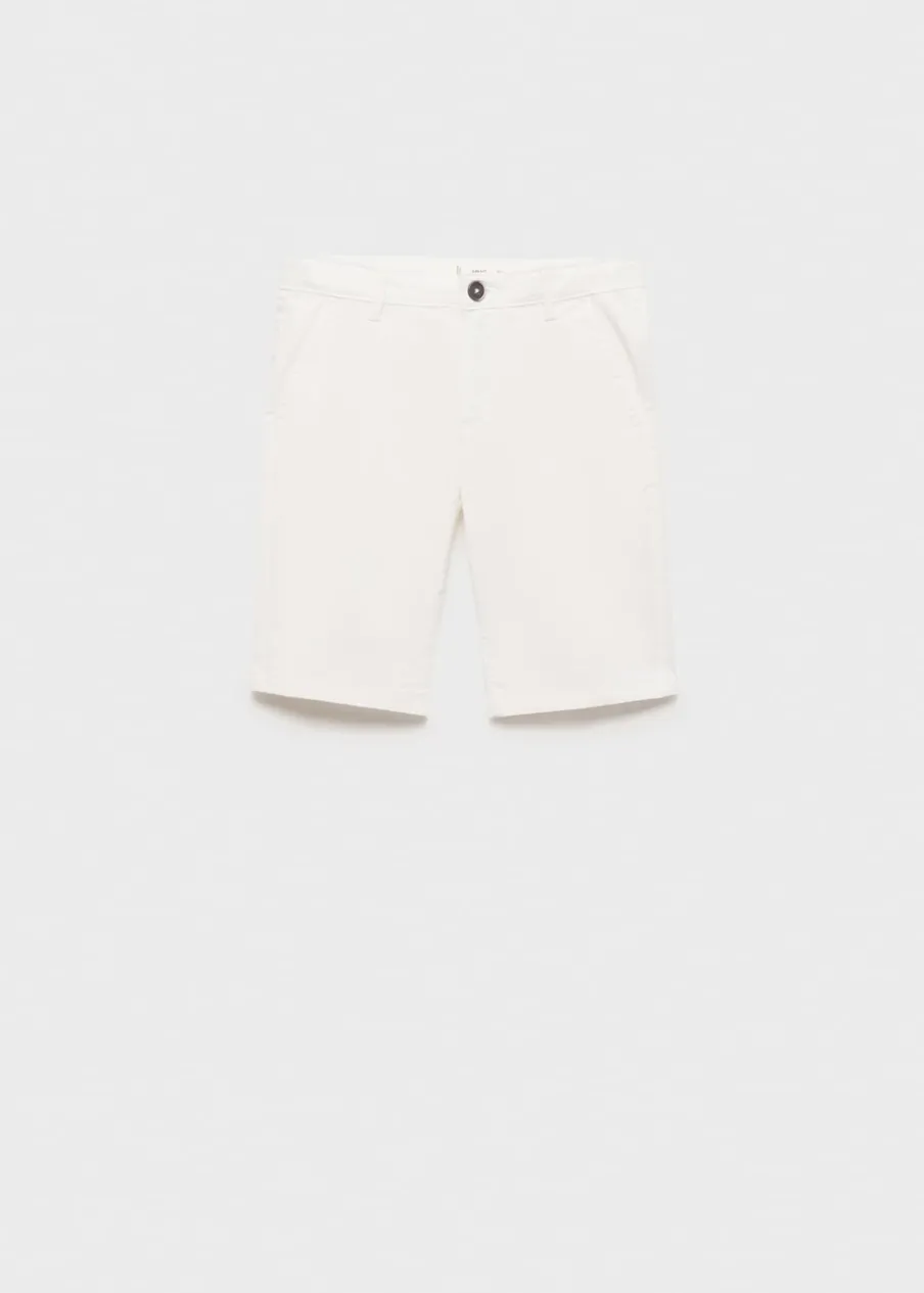 Bawełniana tkanina. Model prosty. Krótki krój. Szlufki. Regulowany pas. Dwie kieszenie z przodu. Dwie wpuszczane kieszenie z tyłu. Zapięcie na guzik z przodu.