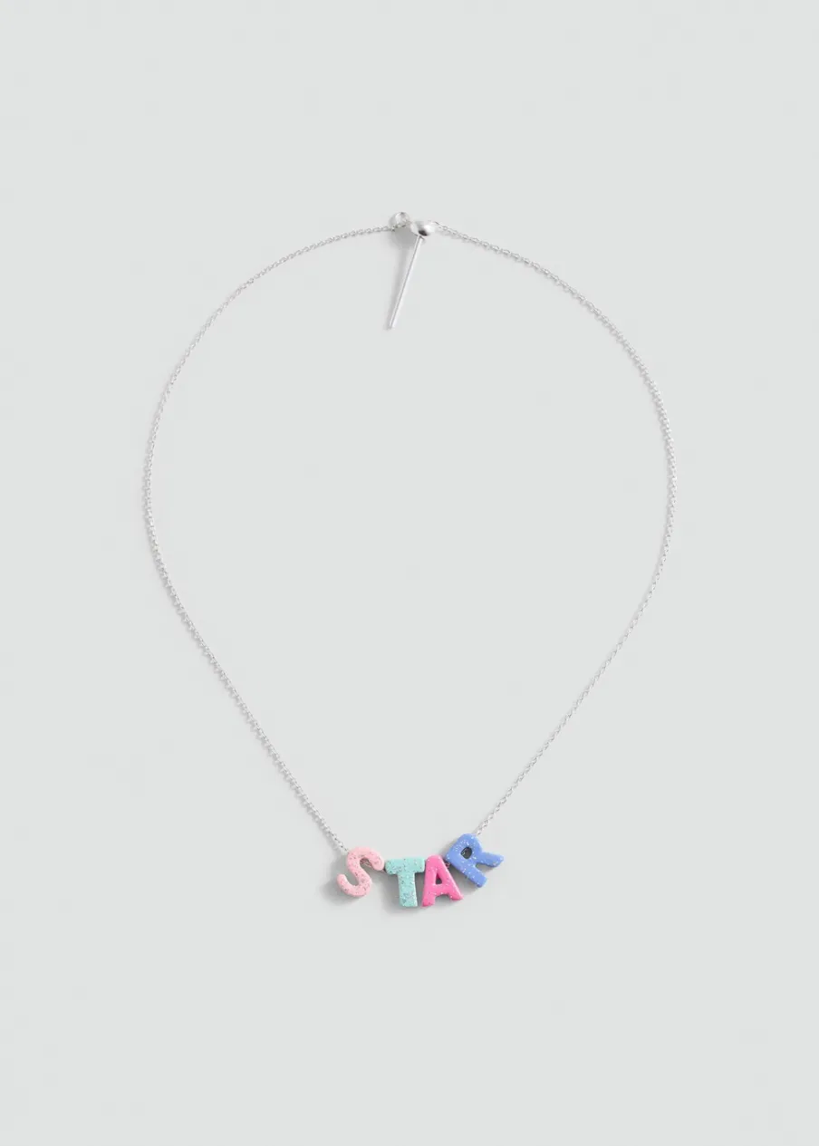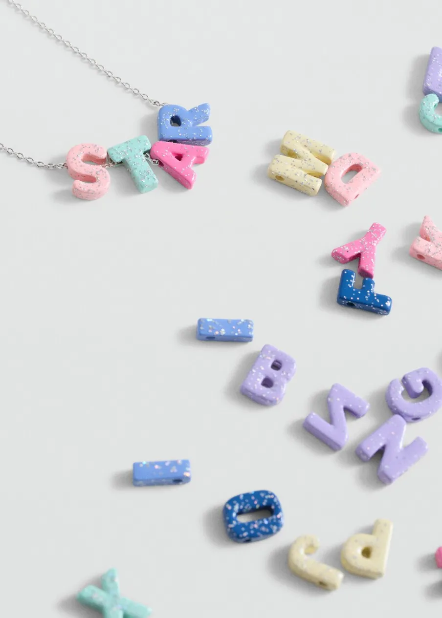 W formie łańcucha. Zawieszki w kształcie liter. Zapięcie na łańcuszek i karabińczyk.