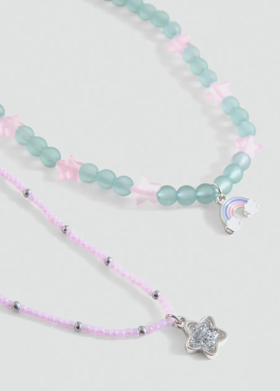 Zestaw 2 szt. Połączenie różnych koralików. Ozdobna gwiazdka. Naszyjnik z wisiorem tęczą. Elastyczne wykończenie.