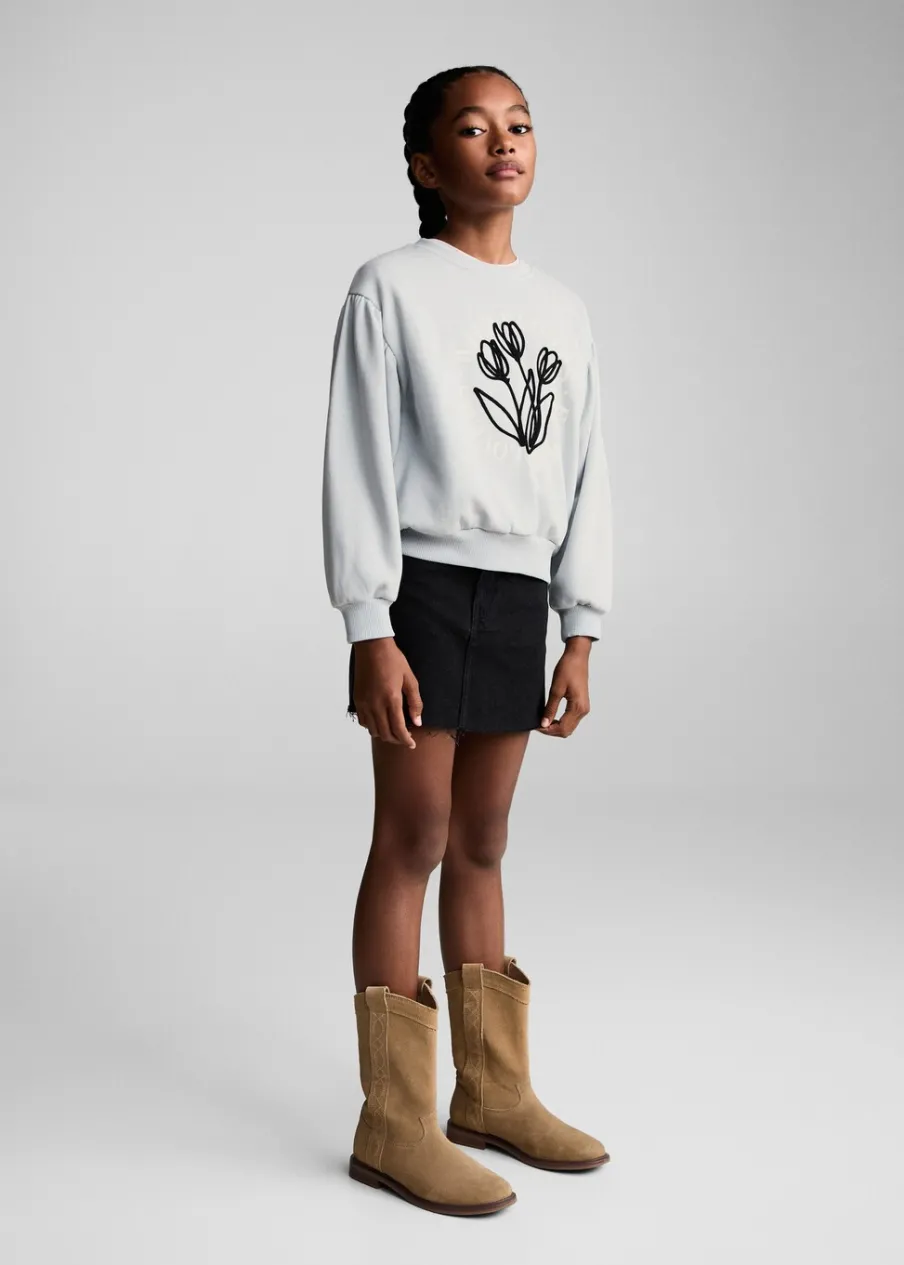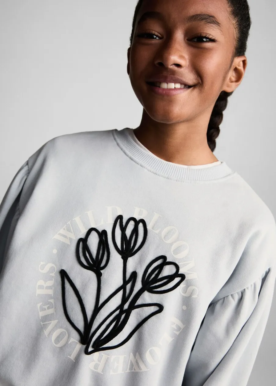 Bawełna 100%. Model prosty. Haftowany detal. Okrągły dekolt. Długi bufiasty rękaw. Materiał czesany. Bez zapięcia.