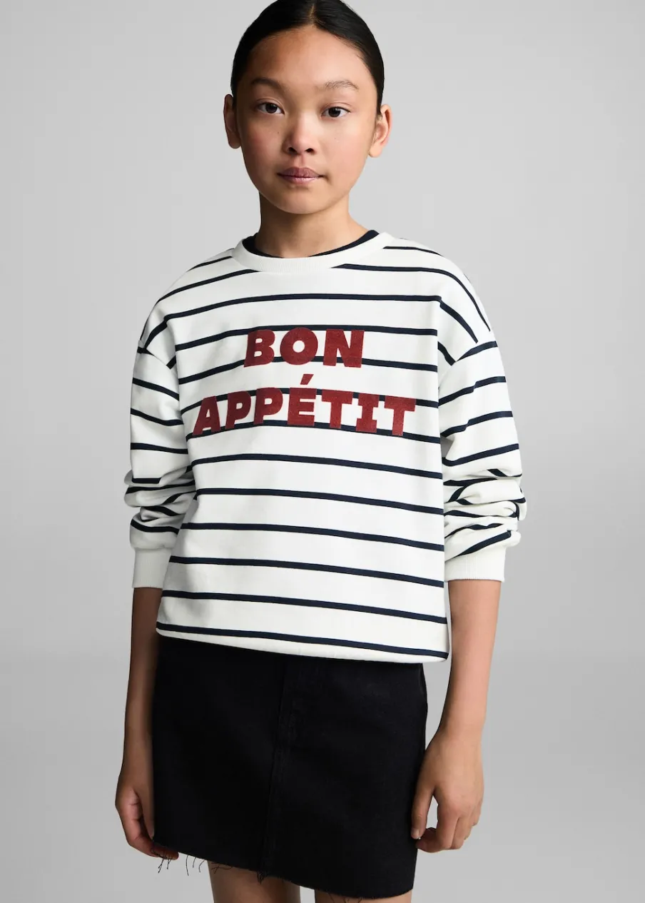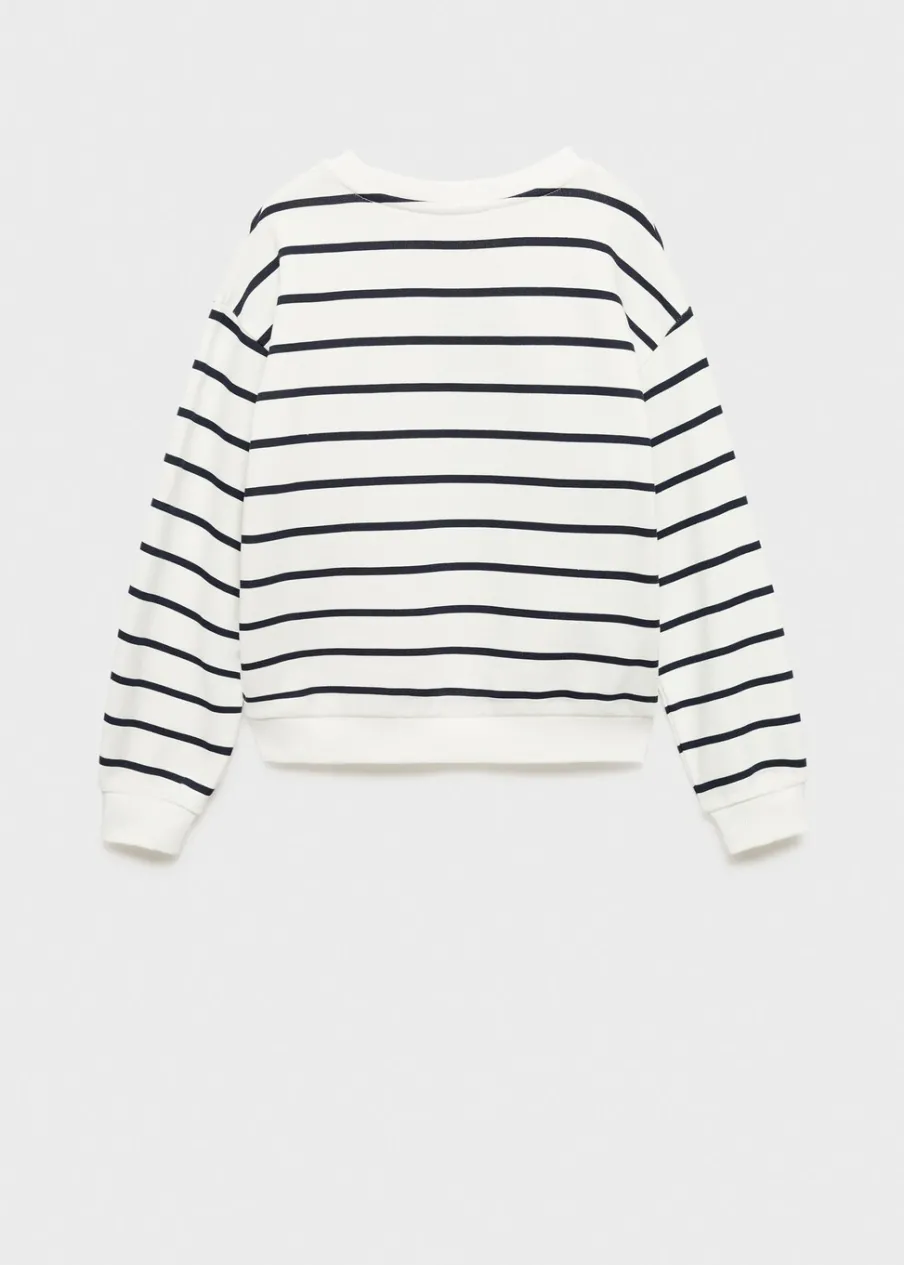 100% bomull. Model prosty. Wzór w litery. Okrągły dekolt. Długi rękaw. Bez zapięcia. Wzór w paski.
