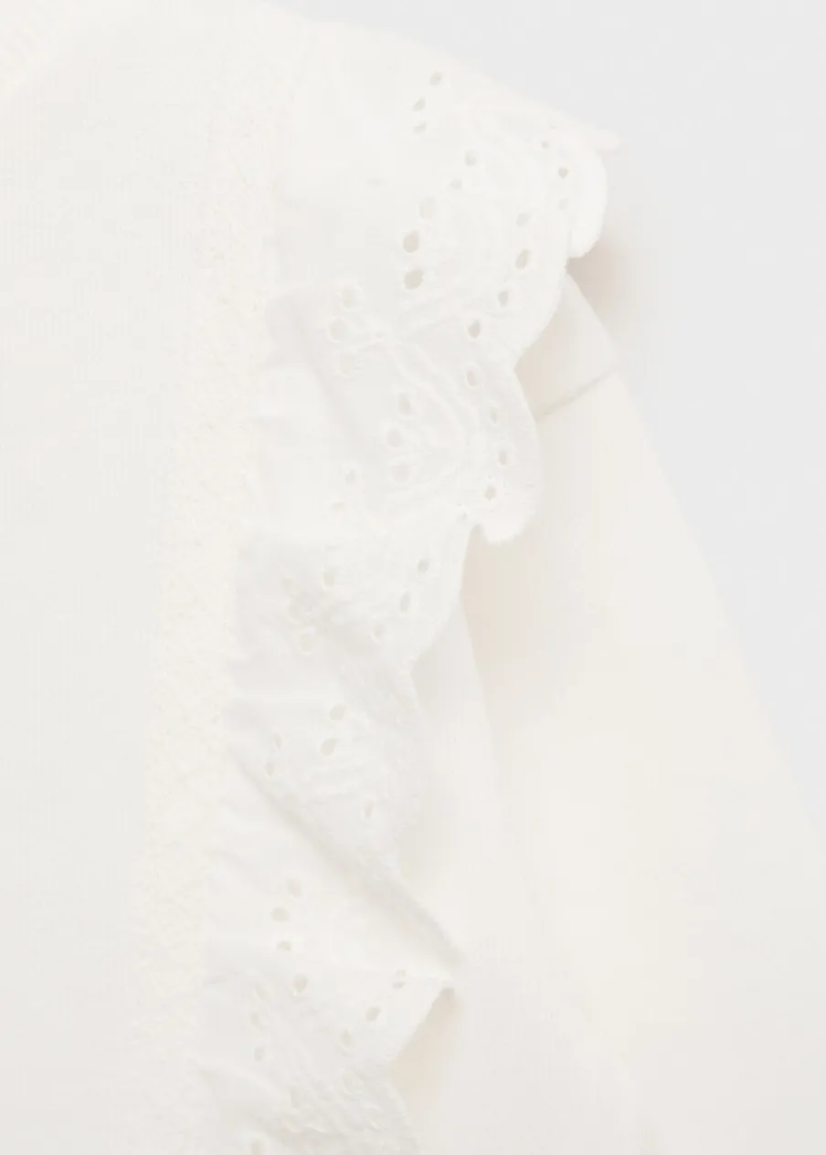 Bawełna 100%. Tkanina z angielskim haftem. Ozdobne falbanki po bokach. Kołnierz, mankiety i dół z prążkowanej dzianiny. Okrągły dekolt. Długi rękaw.