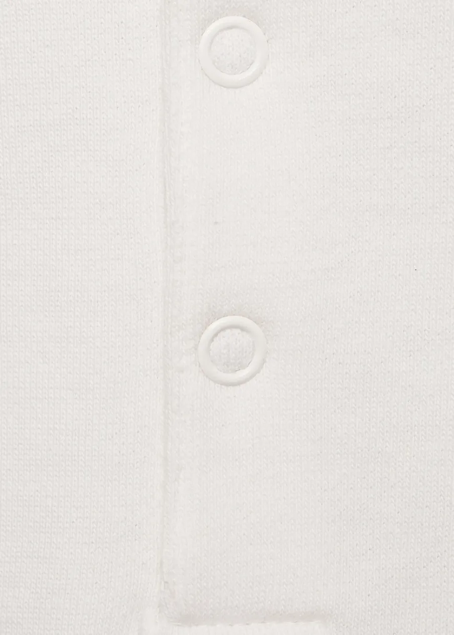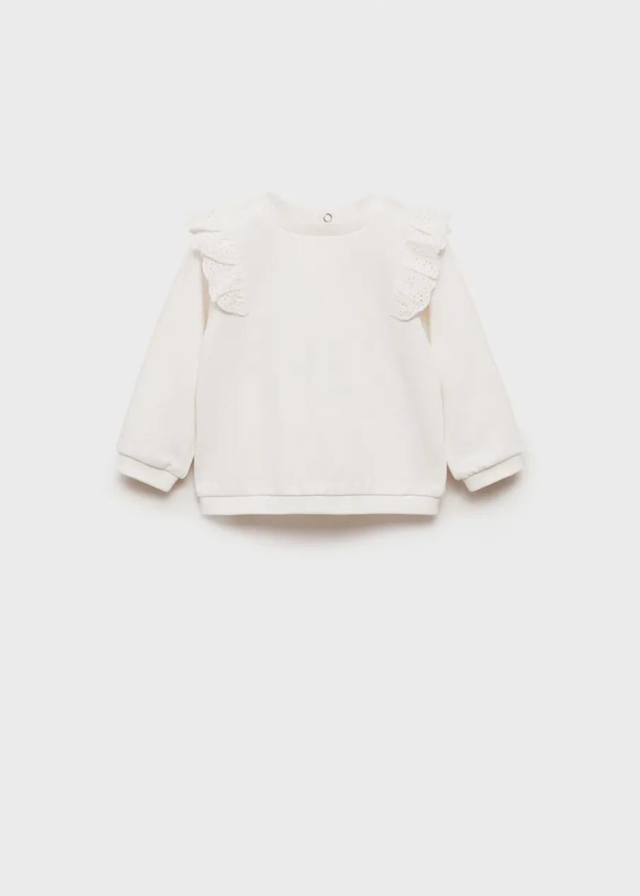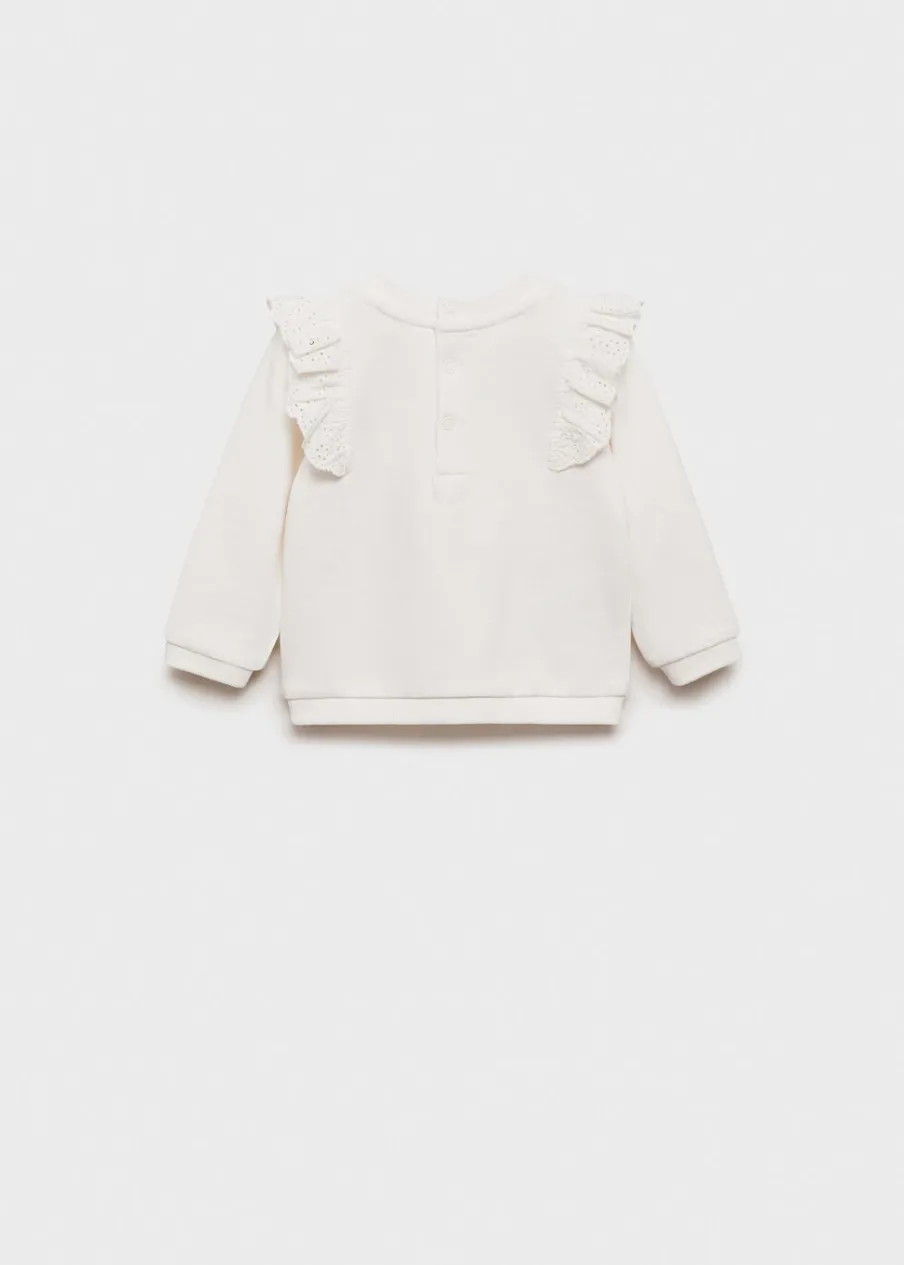 Bawełna 100%. Model prosty. Falbanka z haftem szwajcarskim. Kołnierz, mankiety i dół z prążkowanej dzianiny. Okrągły dekolt. Zapięcie przy szyi.