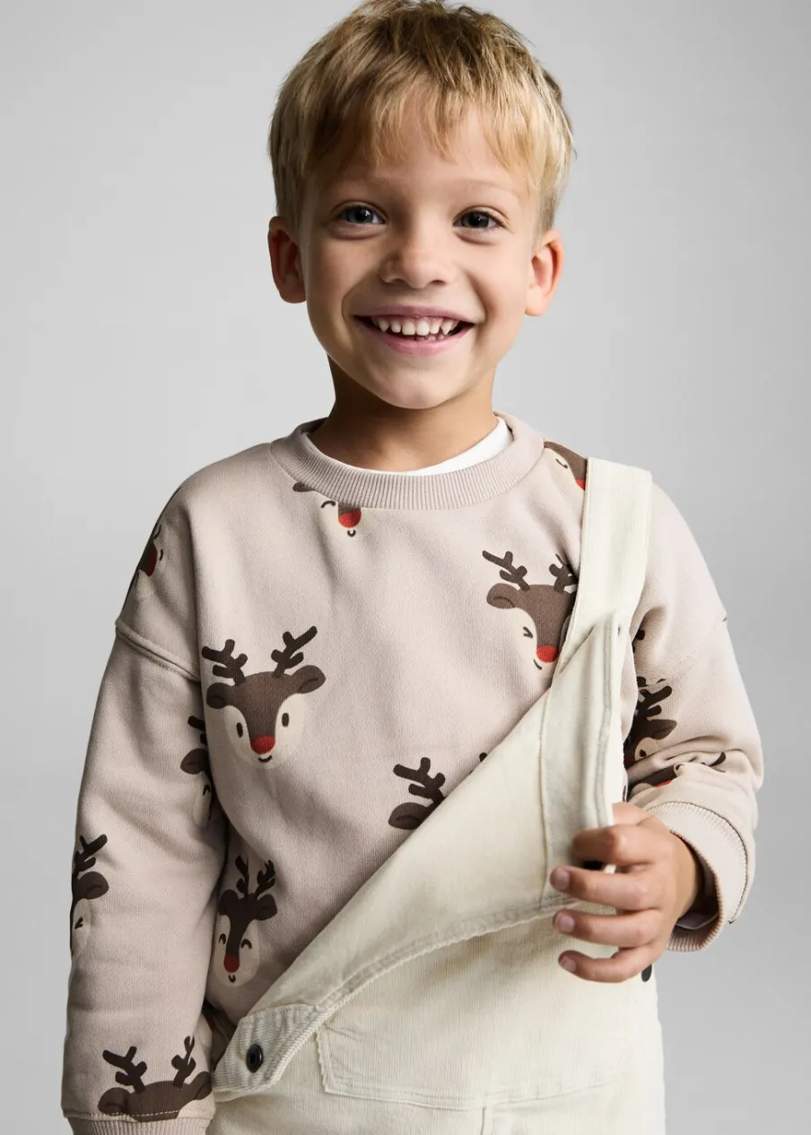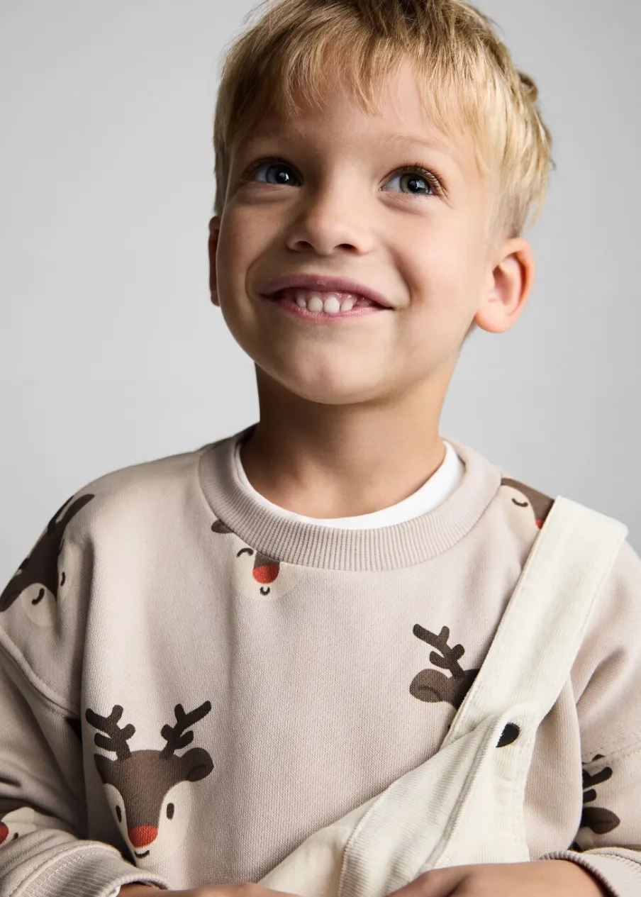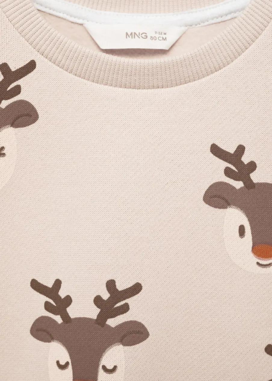 100% bomull. Model prosty. Motyw renifera. Okrągły dekolt. Materiał czesany. Długi rękaw. Kolekcja Bożonarodzeniowa. Bez zapięcia.