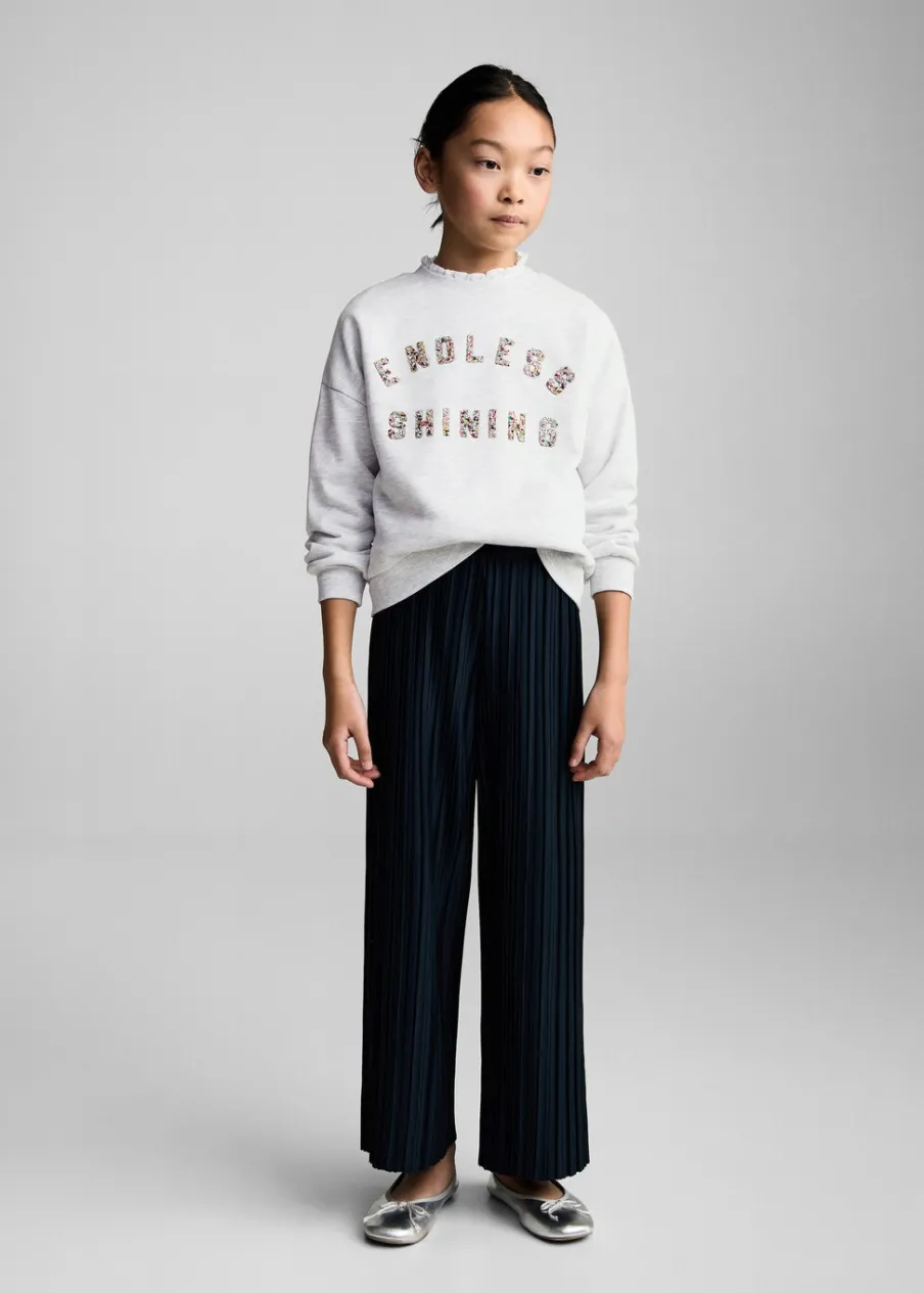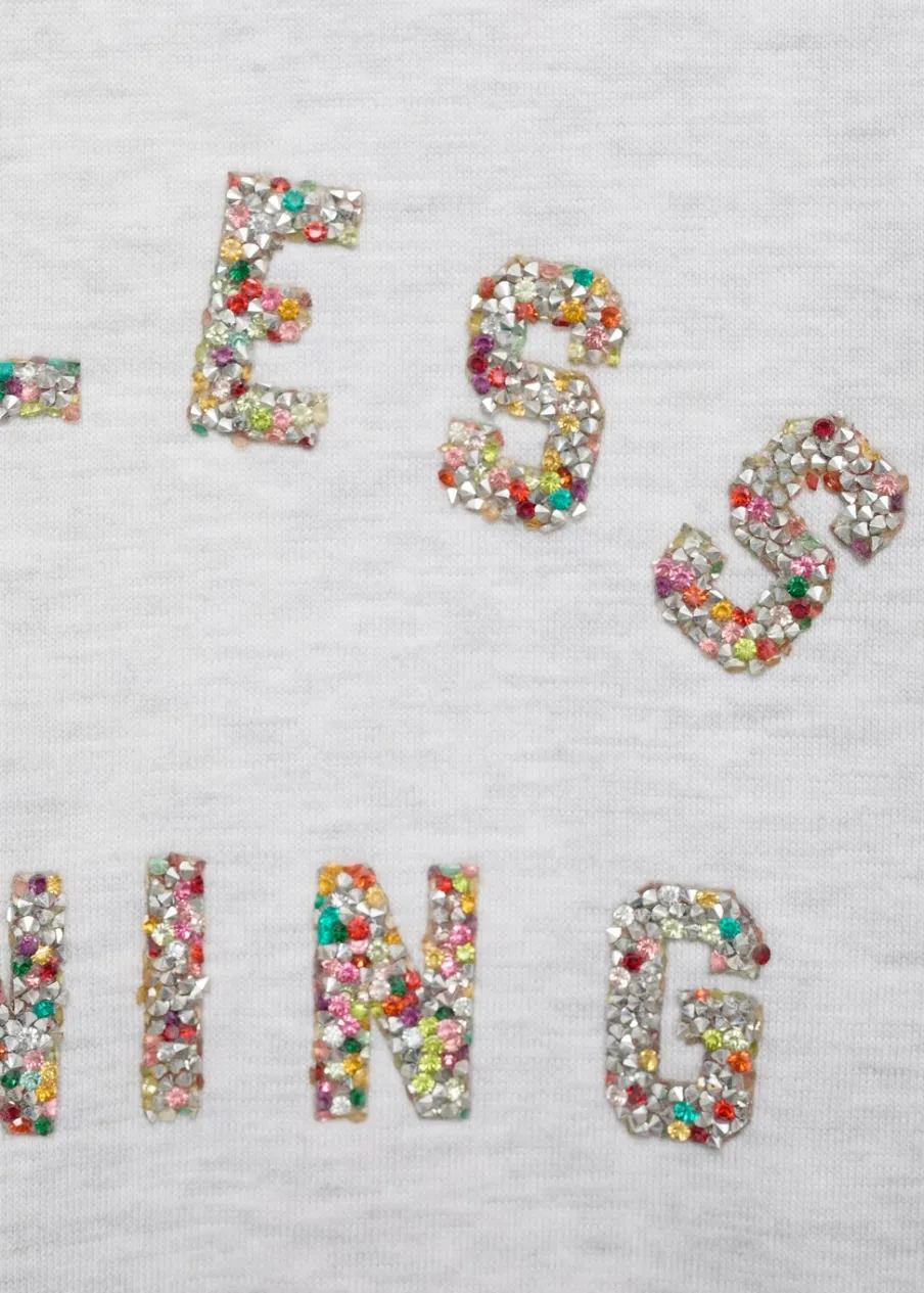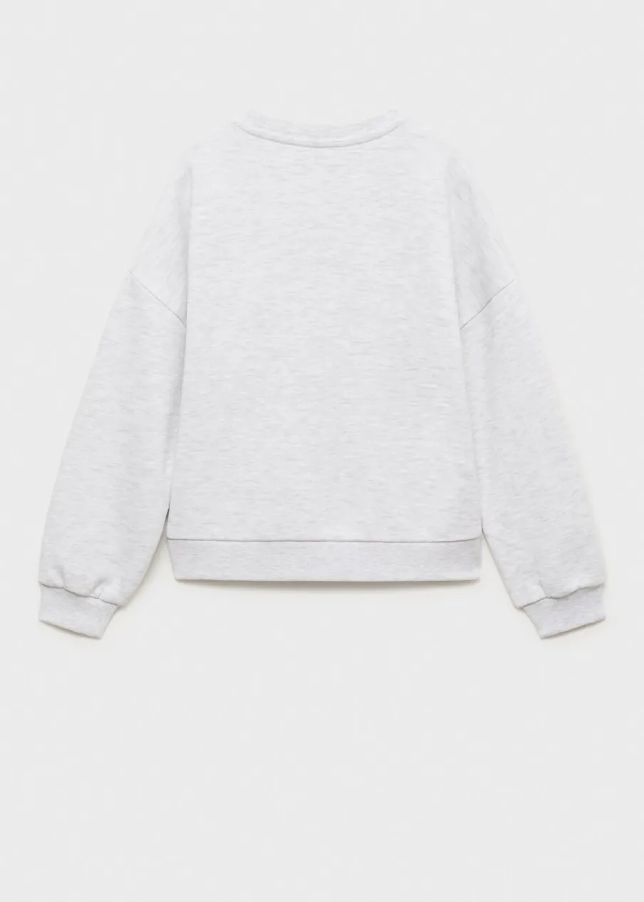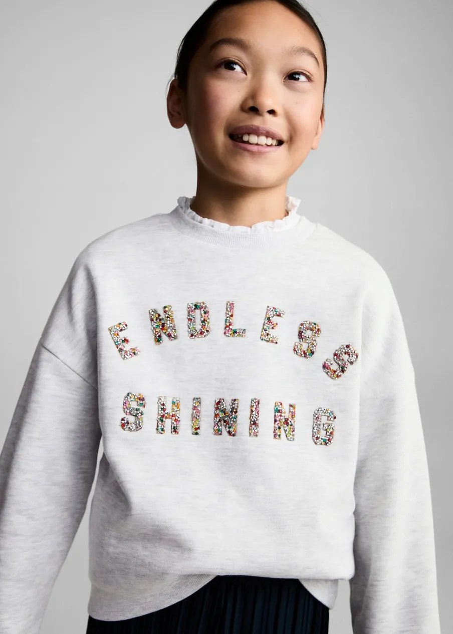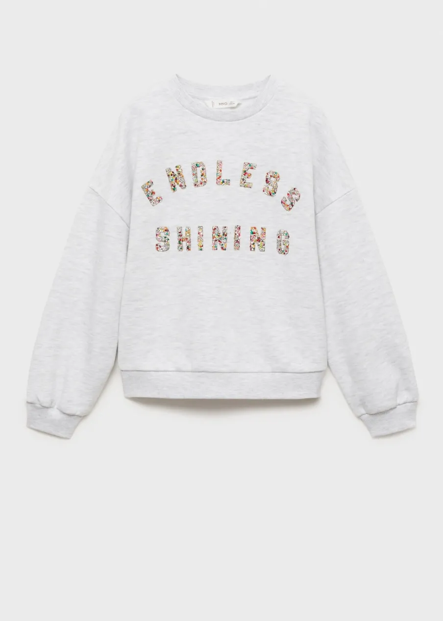 Bawełniana tkanina. Model prosty. Długi rękaw. Okrągły dekolt. Kołnierz, mankiety i dół z prążkowanej dzianiny. Wypukły napis z teksturą. Detal z cekinów. Bez zapięcia.
