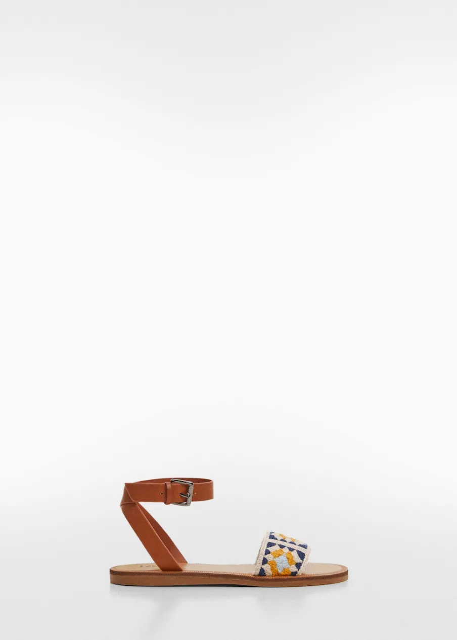 Haftowana tkanina. Rozporek z przodu. Okrągły nosek. Płaska podeszwa. PU. Zapięcie na klamrę.