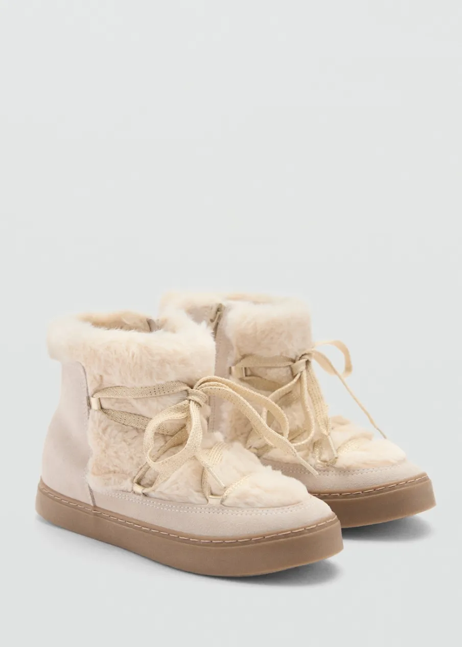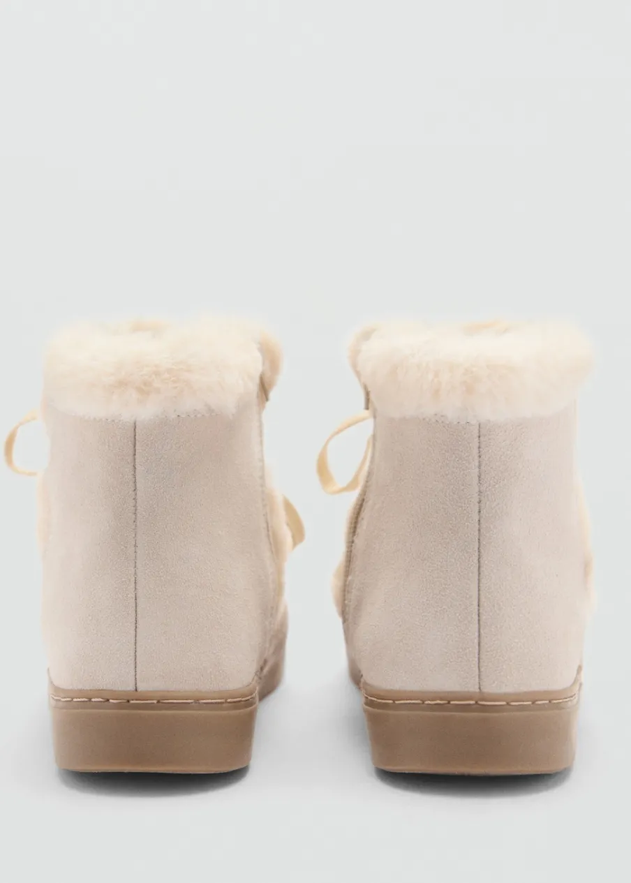 Skóra bydlęca. Włochata tekstura. Okrągły nosek. Wiązanie na sznurek. Zapięcie na suwak. Kolekcja Bożonarodzeniowa.