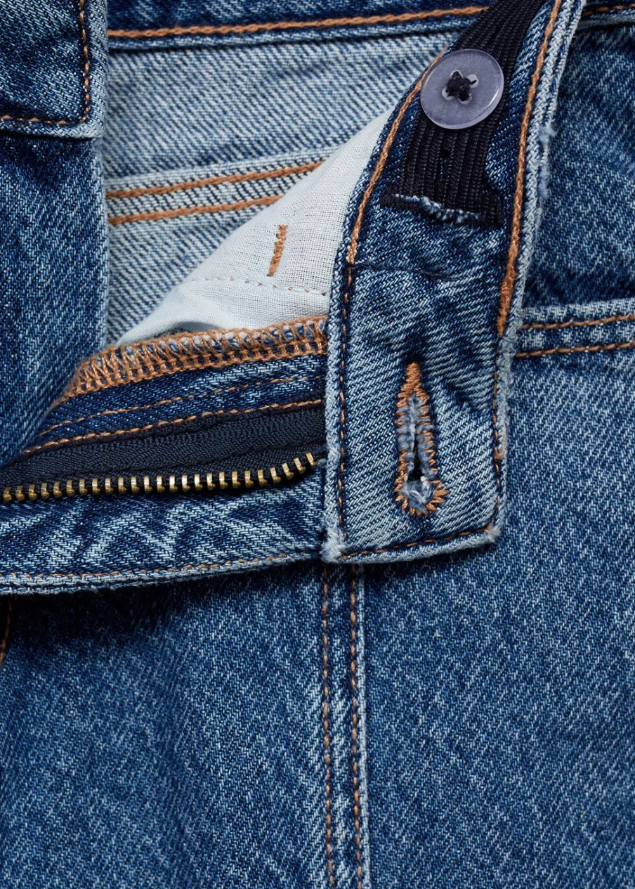 Tkanina bawełniana w dżinsowym stylu. Podwyższony stan. Model prosty. Ozdobne szwy. Pięć kieszeni. Fason culotte. Zapięcie na suwak i guzik.
