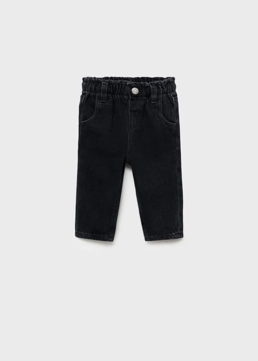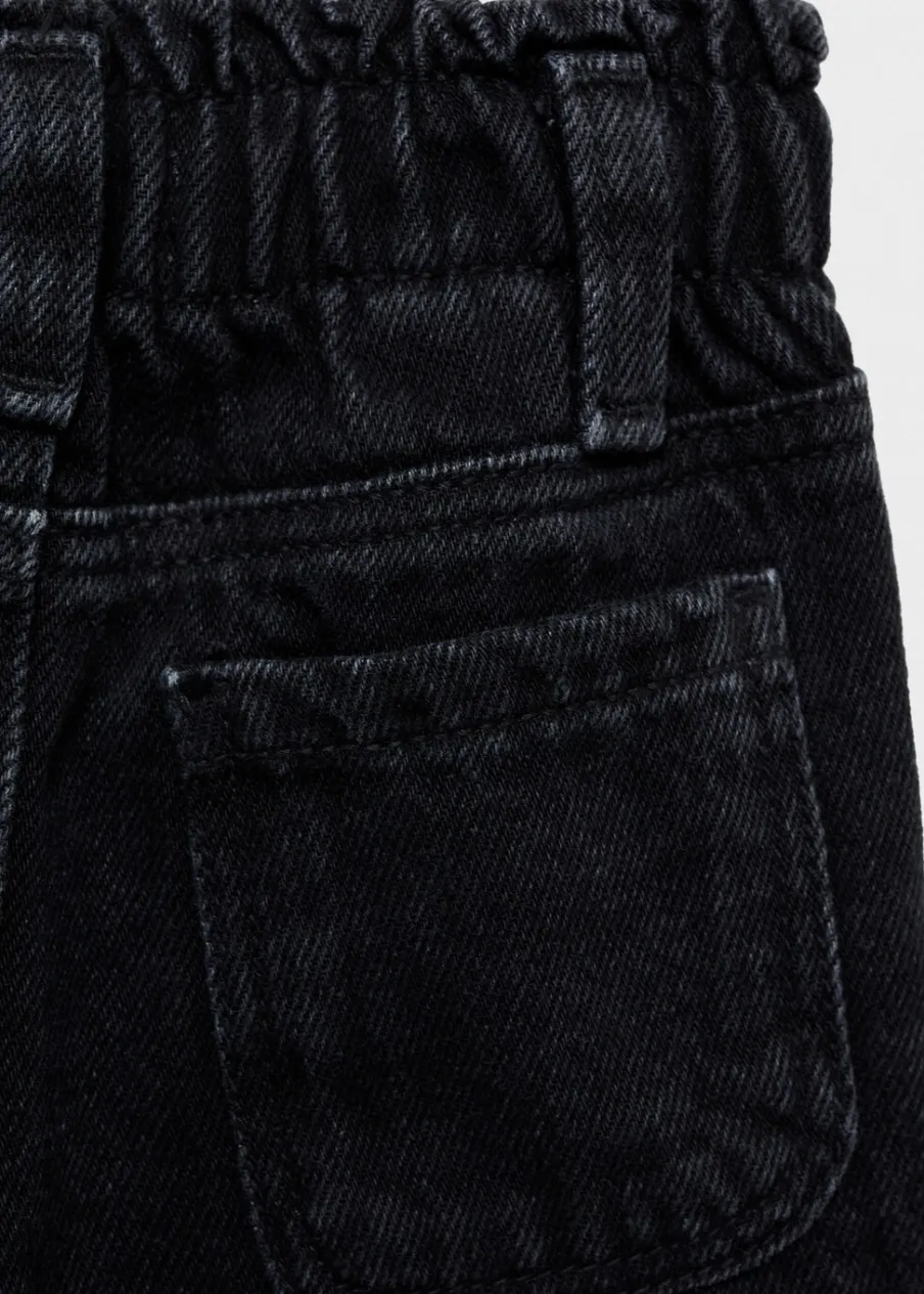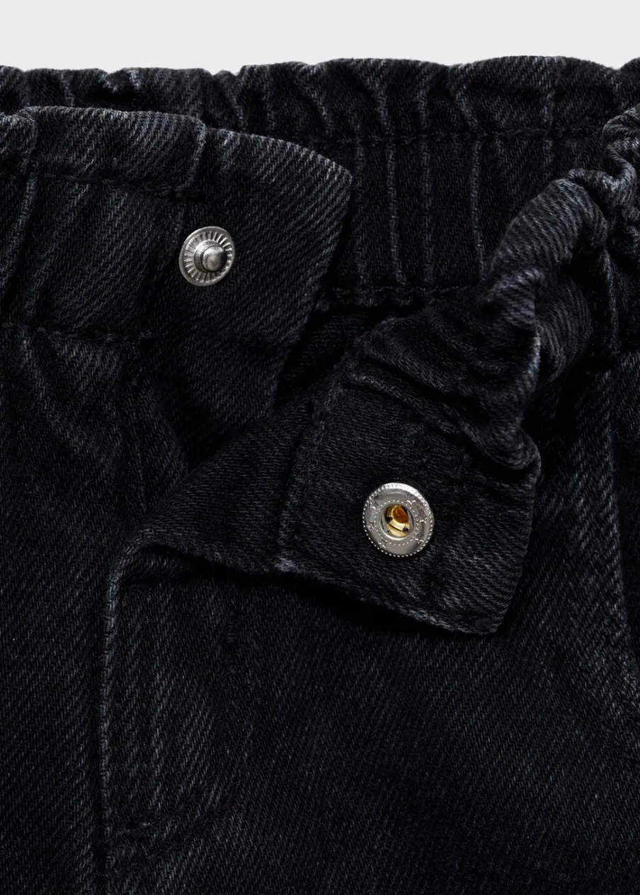 Tkanina bawełniana w dżinsowym stylu. Krój paperbag. Dopasowany fason. Dżinsy z elastycznym pasem. Zapięcie na zatrzaskowy guzik.