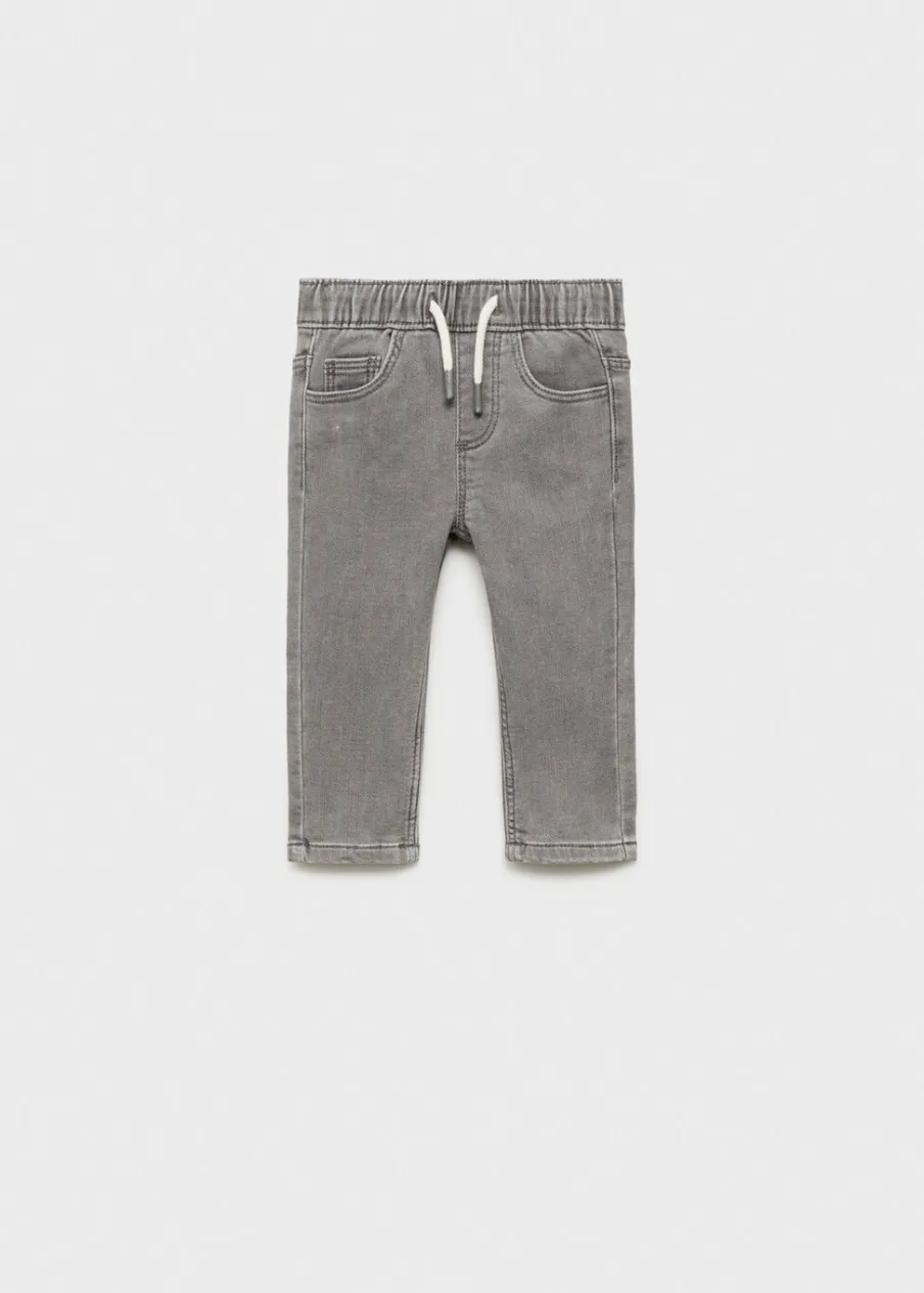 Bawełniana tkanina. Model prosty. Elastyczny pas. Wiązanie na sznurek. Pięć kieszeni.