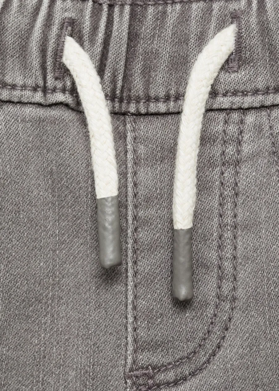 OpisBawełniana tkanina. Model prosty. Elastyczny pas. Wiązanie na sznurek. Pięć kieszeni.