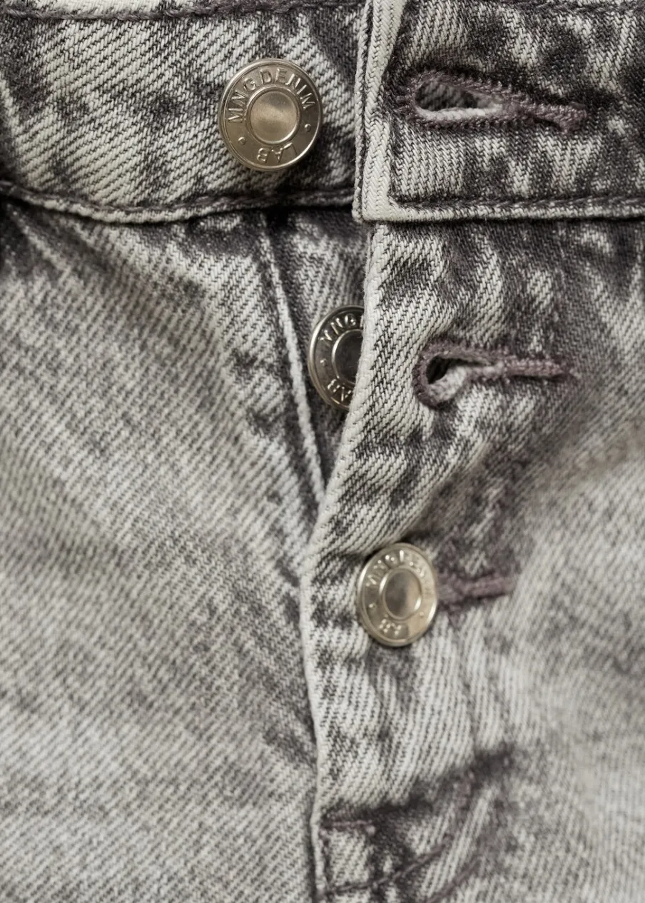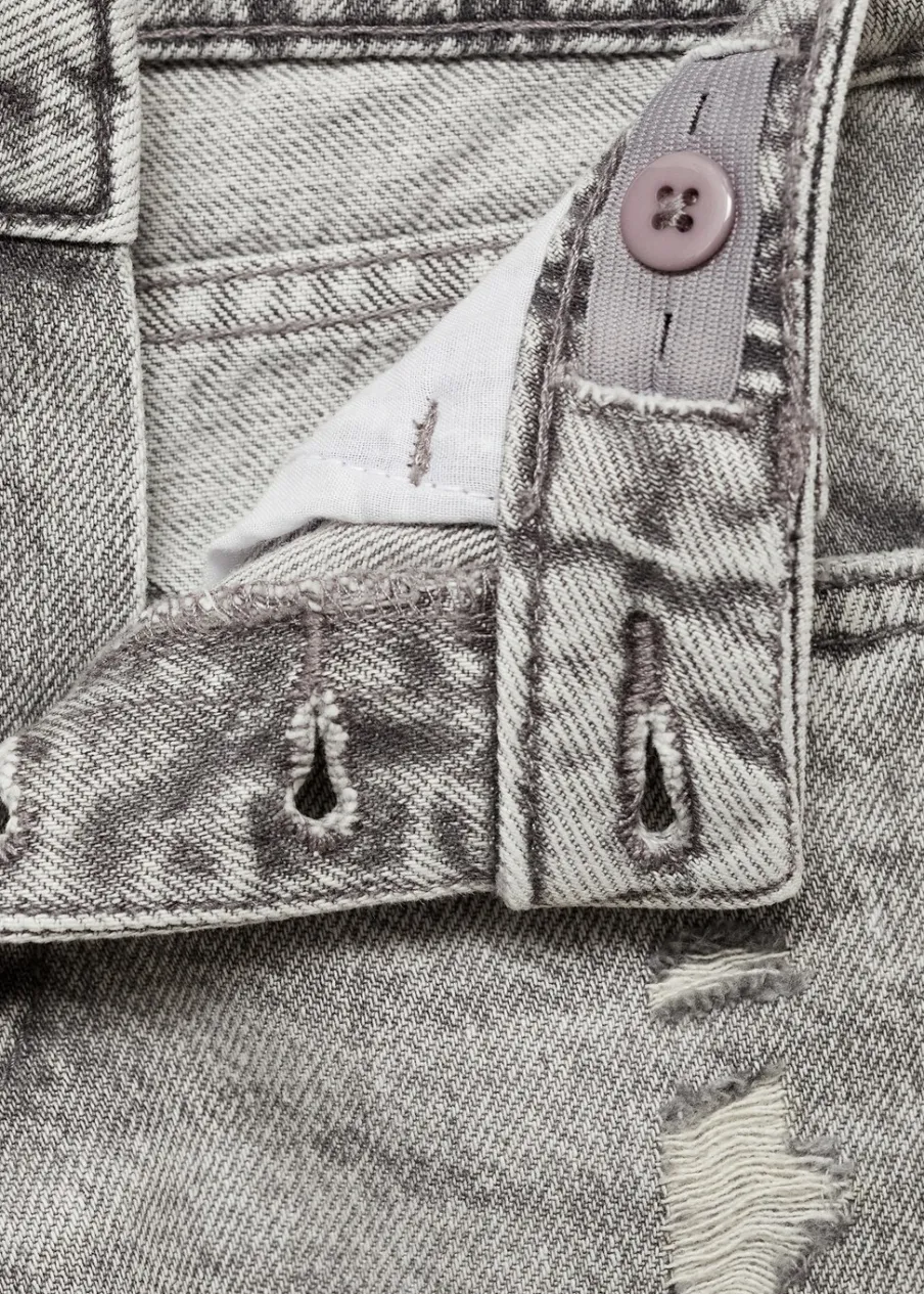 Tkanina bawełniana w dżinsowym stylu. Mom-fit. Model długi. Model prosty. Pięć kieszeni. Ozdobne rozdarcia. Zapięcie na guziki.