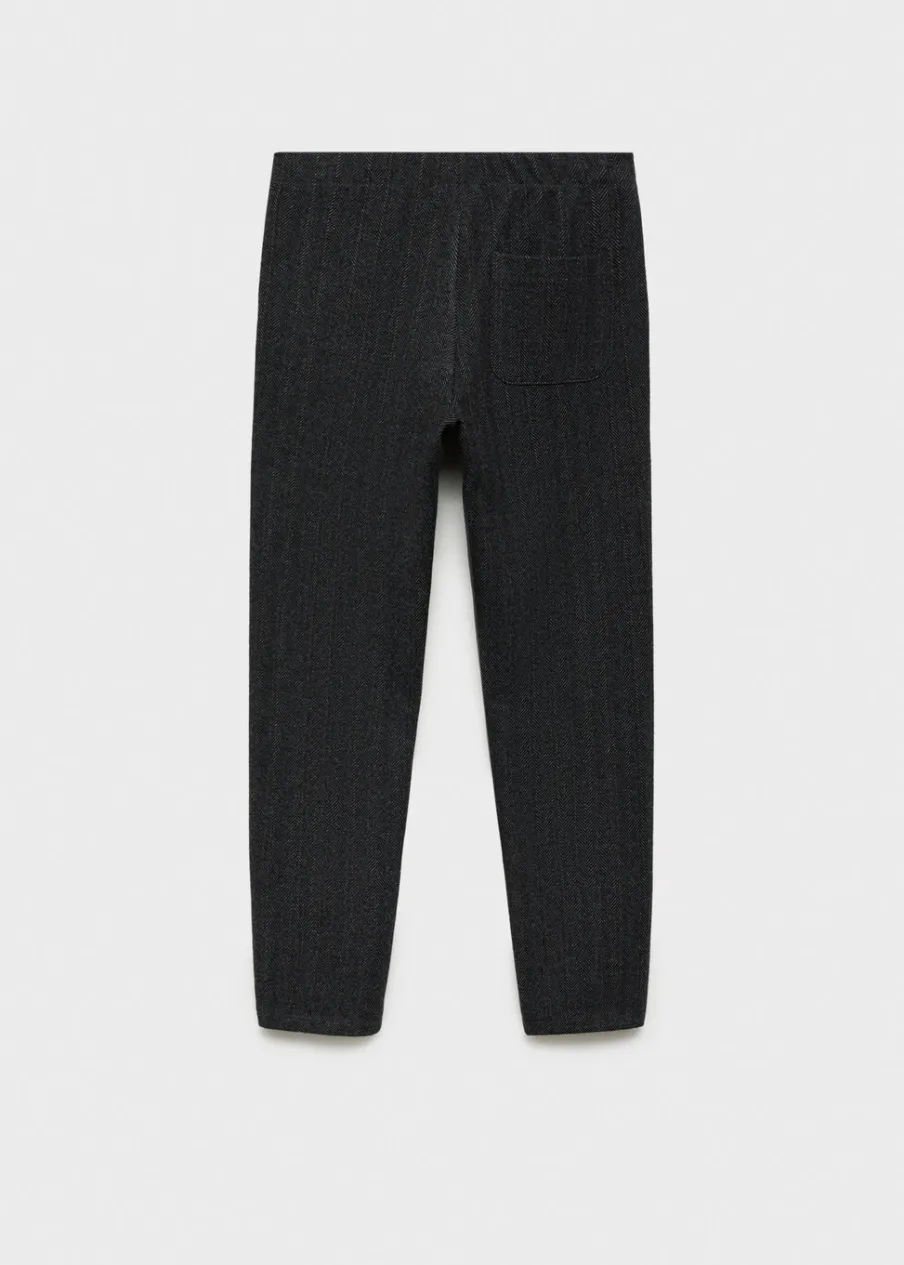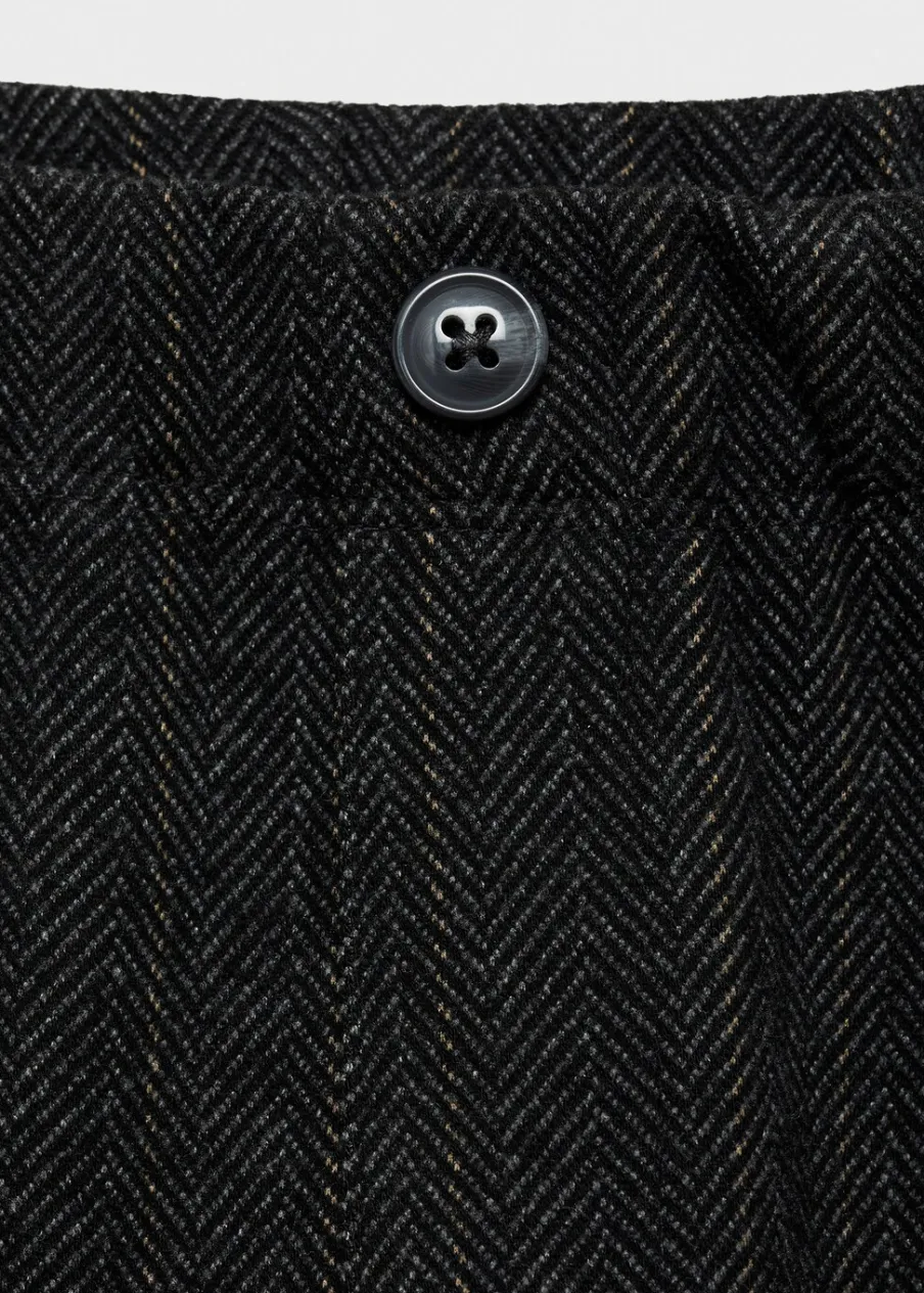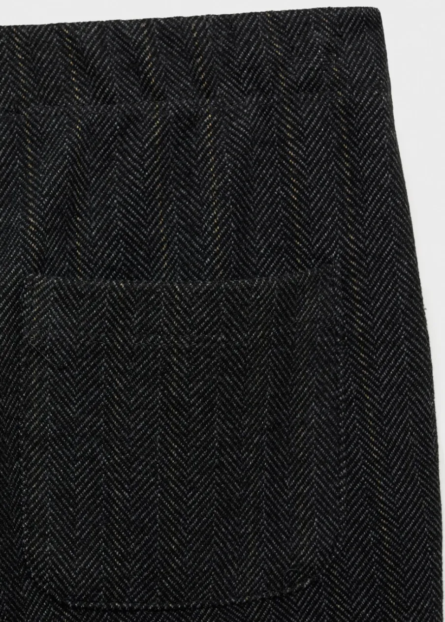 Model prosty. Model długi. Ozdobny guzik. Jodełkowy deseń. Dwie kieszenie boczne. Nakładana kieszeń z tyłu. Elastyczny pas.