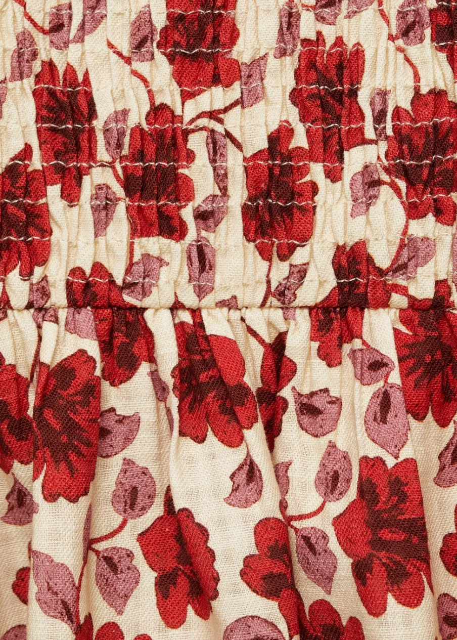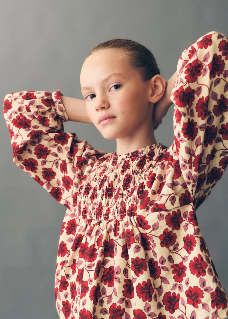Bawełna 100%. Wzór w kwiaty. Model prosty. Okrągły dekolt. Długi rękaw. Marszczona tekstura. Marszczony panel ze ściegiem typu plaster miodu. Zapięcie na guzik. Limitowana edycja.