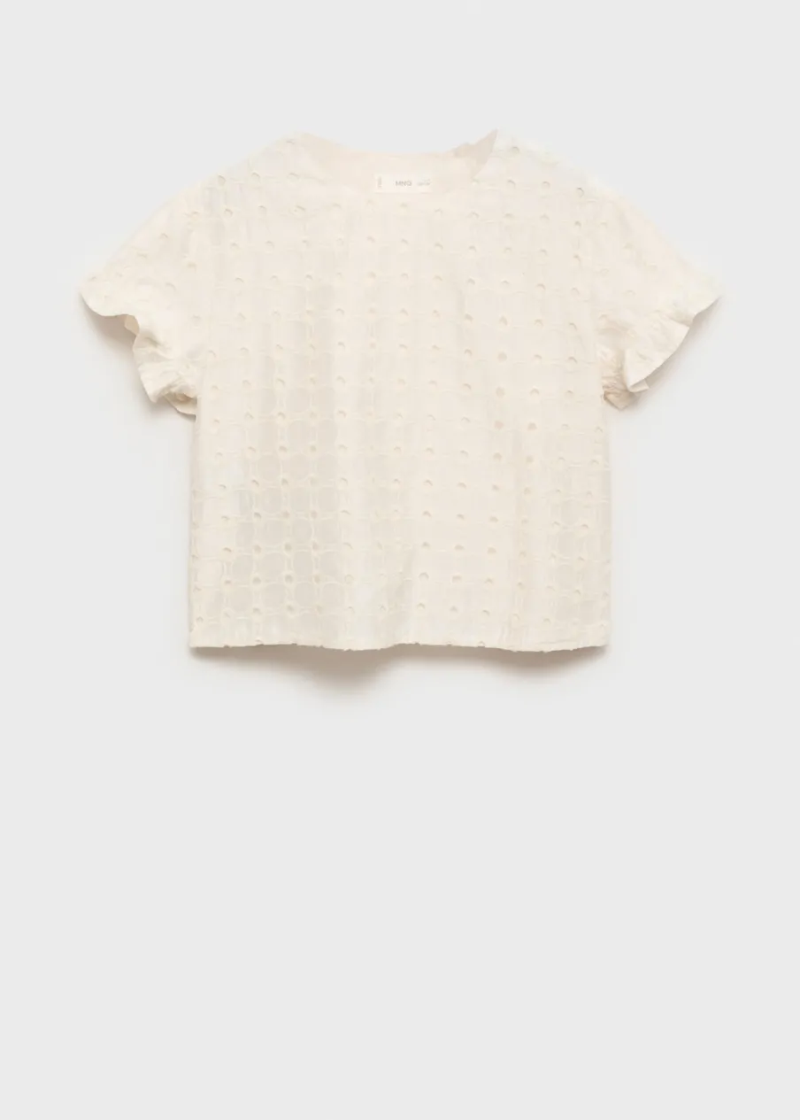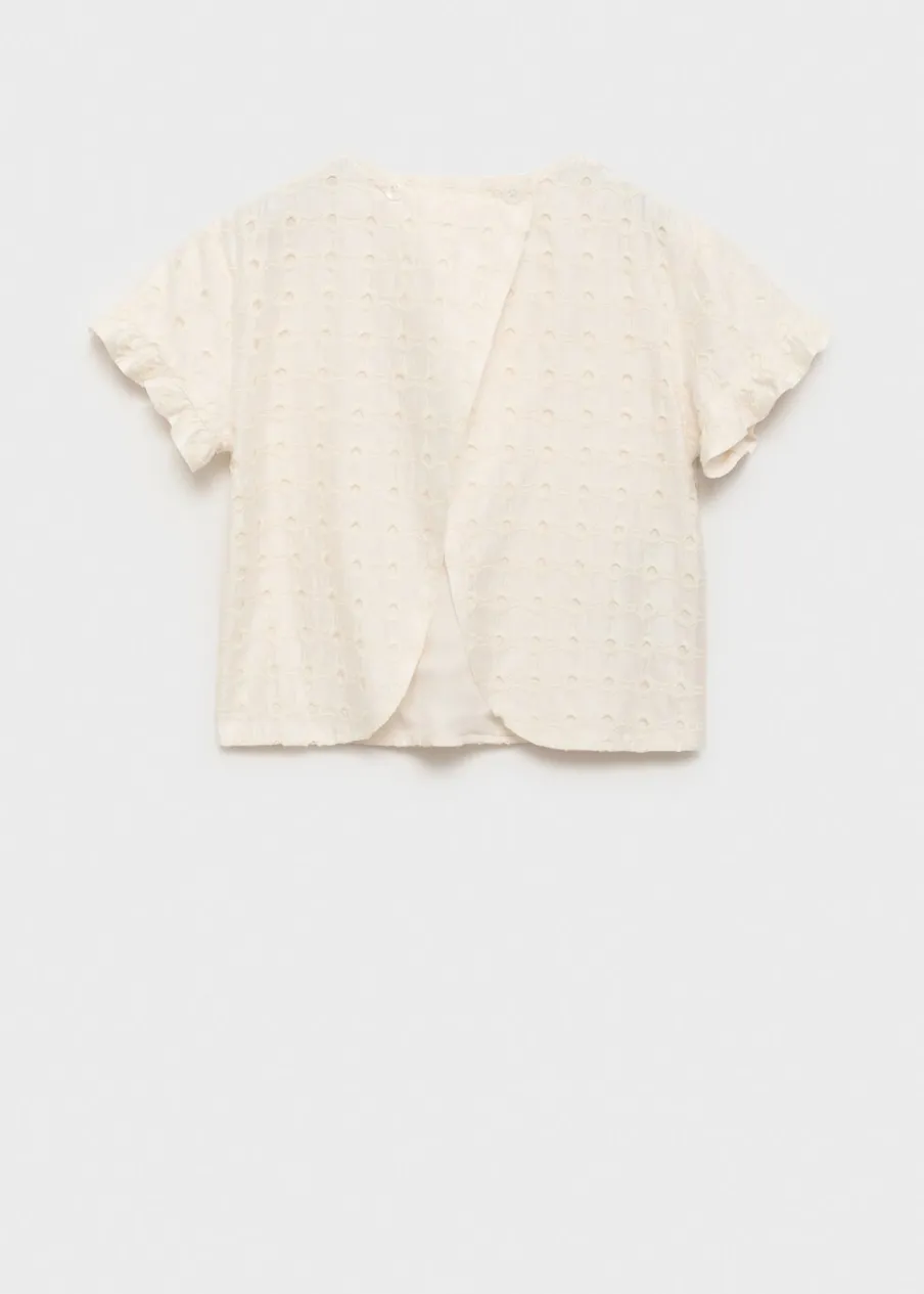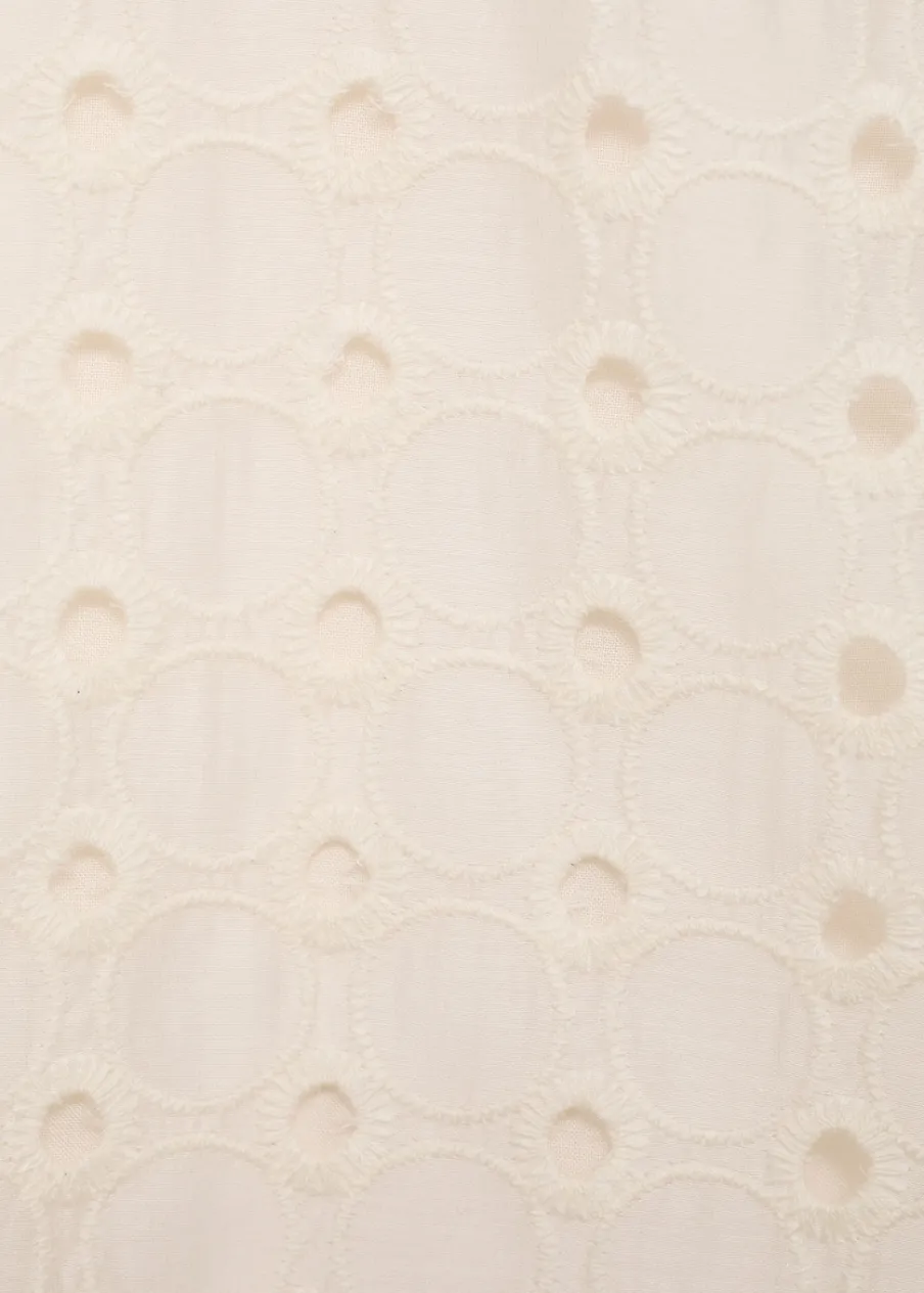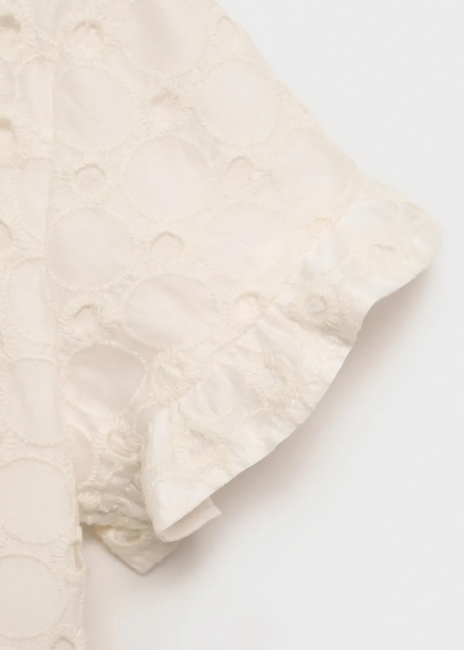 Bawełniana tkanina. Tkanina z angielskim haftem. Krótki rękaw. Okrągły dekolt. Skrzyżowane wycięcie na plecach. Plisowane mankiety.