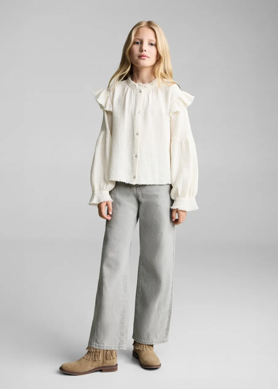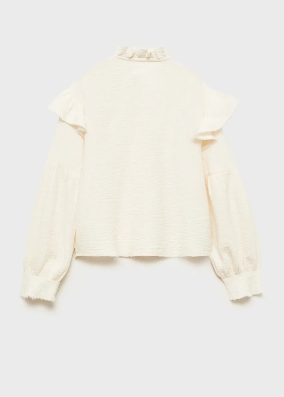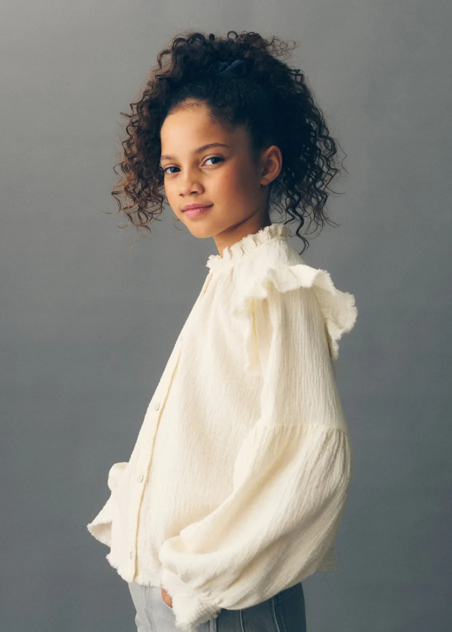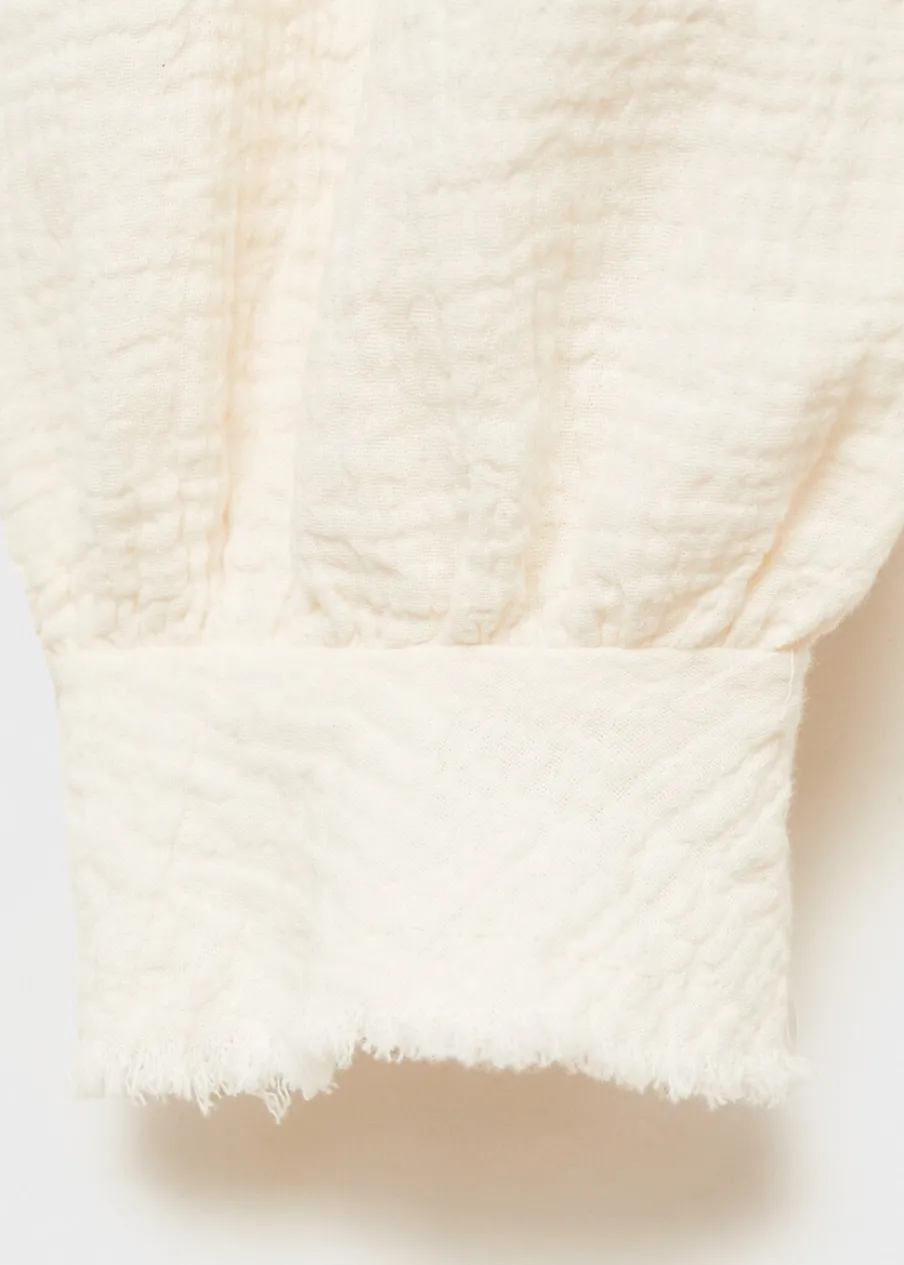 Tkanina z 100% bawełny. W romantycznym stylu. Kreszowana tkanina. Falbanki na ramionach. Długi bufiasty rękaw. Marszczone mankiety. Postrzępione wykończenie. Zapięcie na guziki z przodu. Limitowana edycja.