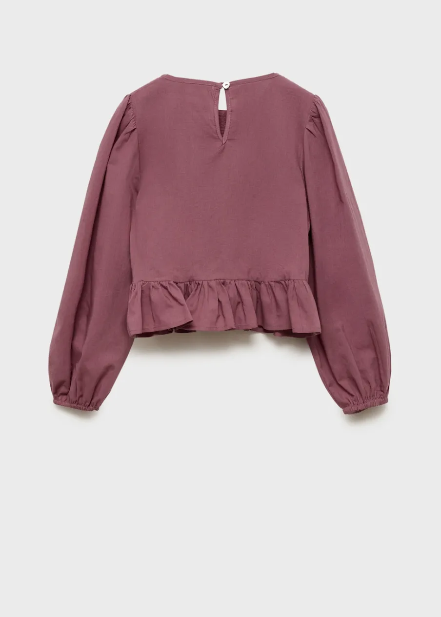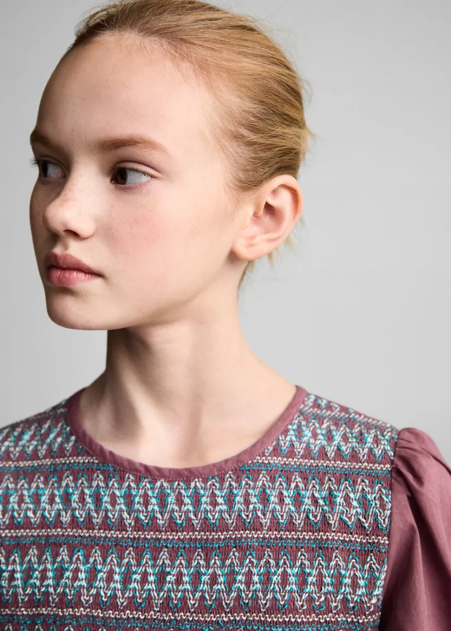 Bawełna 100%. Marszczony panel ze ściegiem typu plaster miodu. Falbanki u dołu. Model prosty. Okrągły dekolt. Długi rękaw z elastycznymi mankietami.