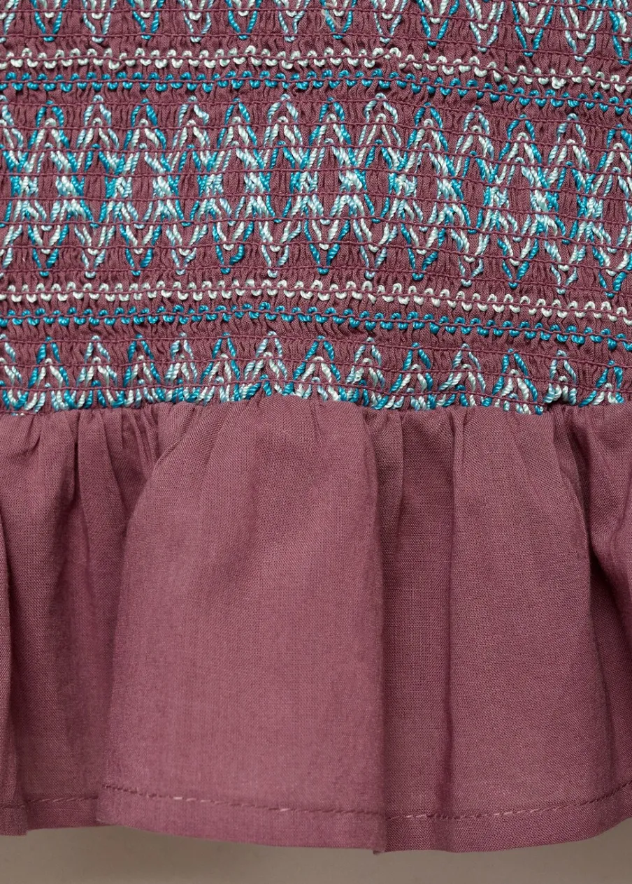OpisBawełna 100%. Marszczony panel ze ściegiem typu plaster miodu. Falbanki u dołu. Model prosty. Okrągły dekolt. D…
