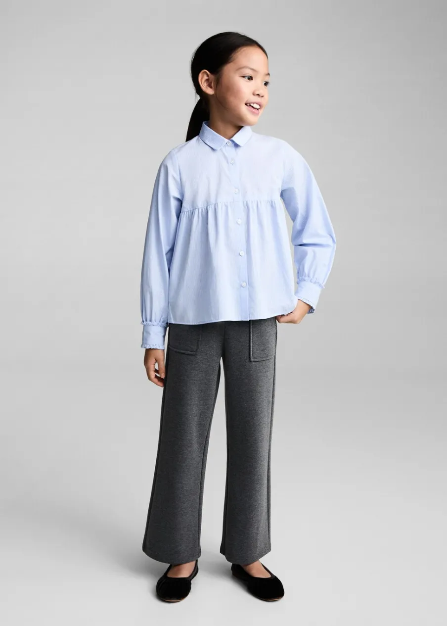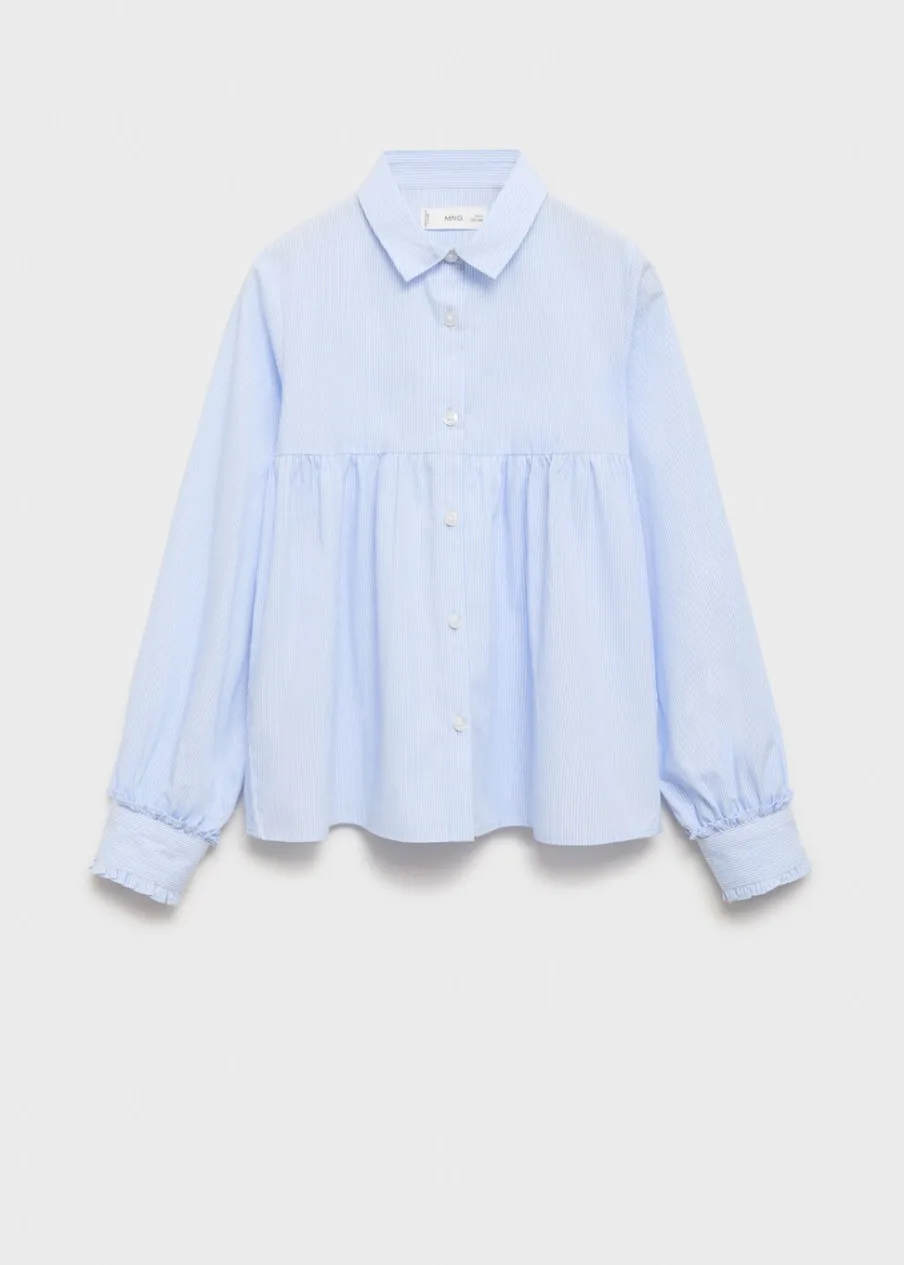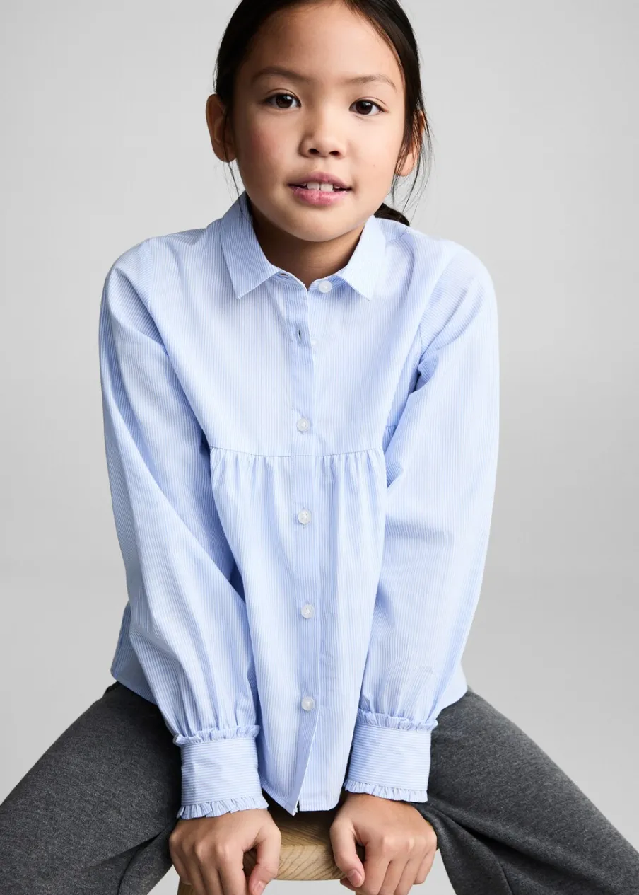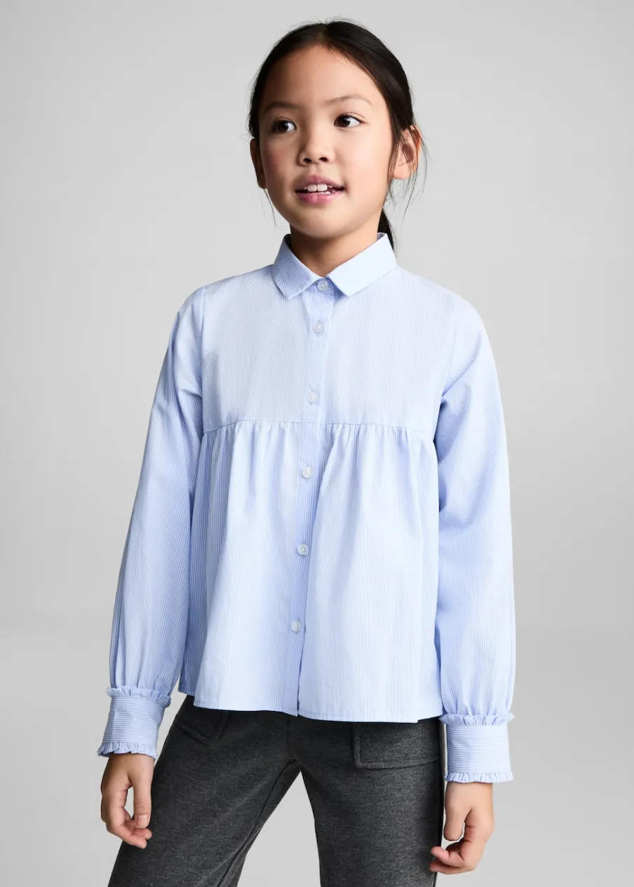 Bawełna 100%. Deseń w pasy. Detal z falbaną. Koszulowy kołnierz. Długi rękaw. Zapięcie na guziki.