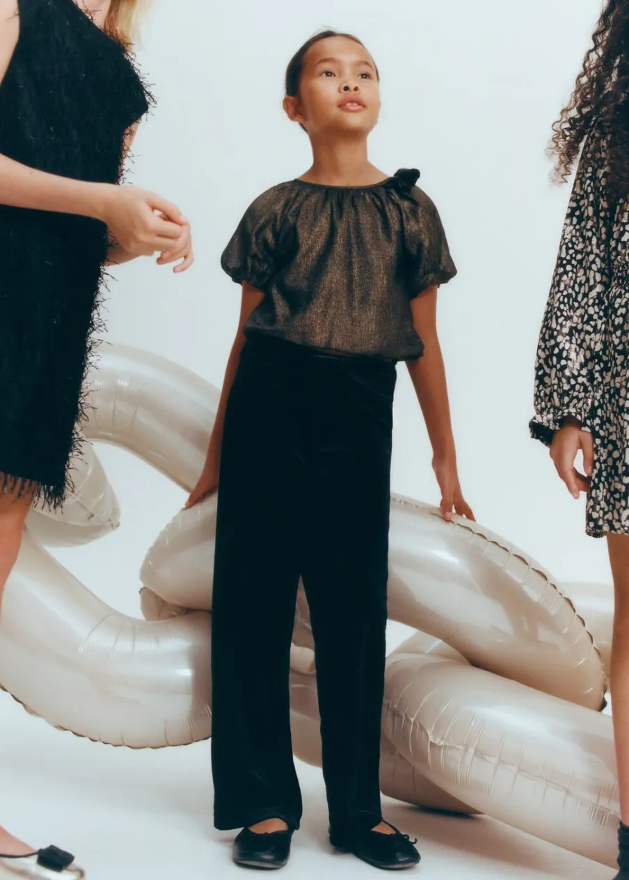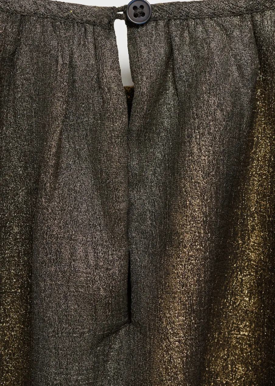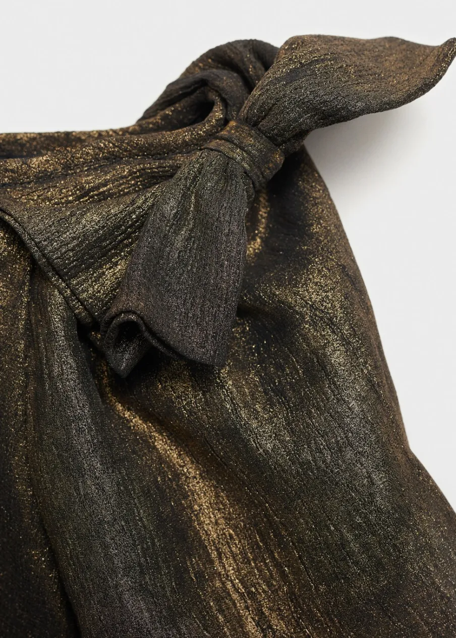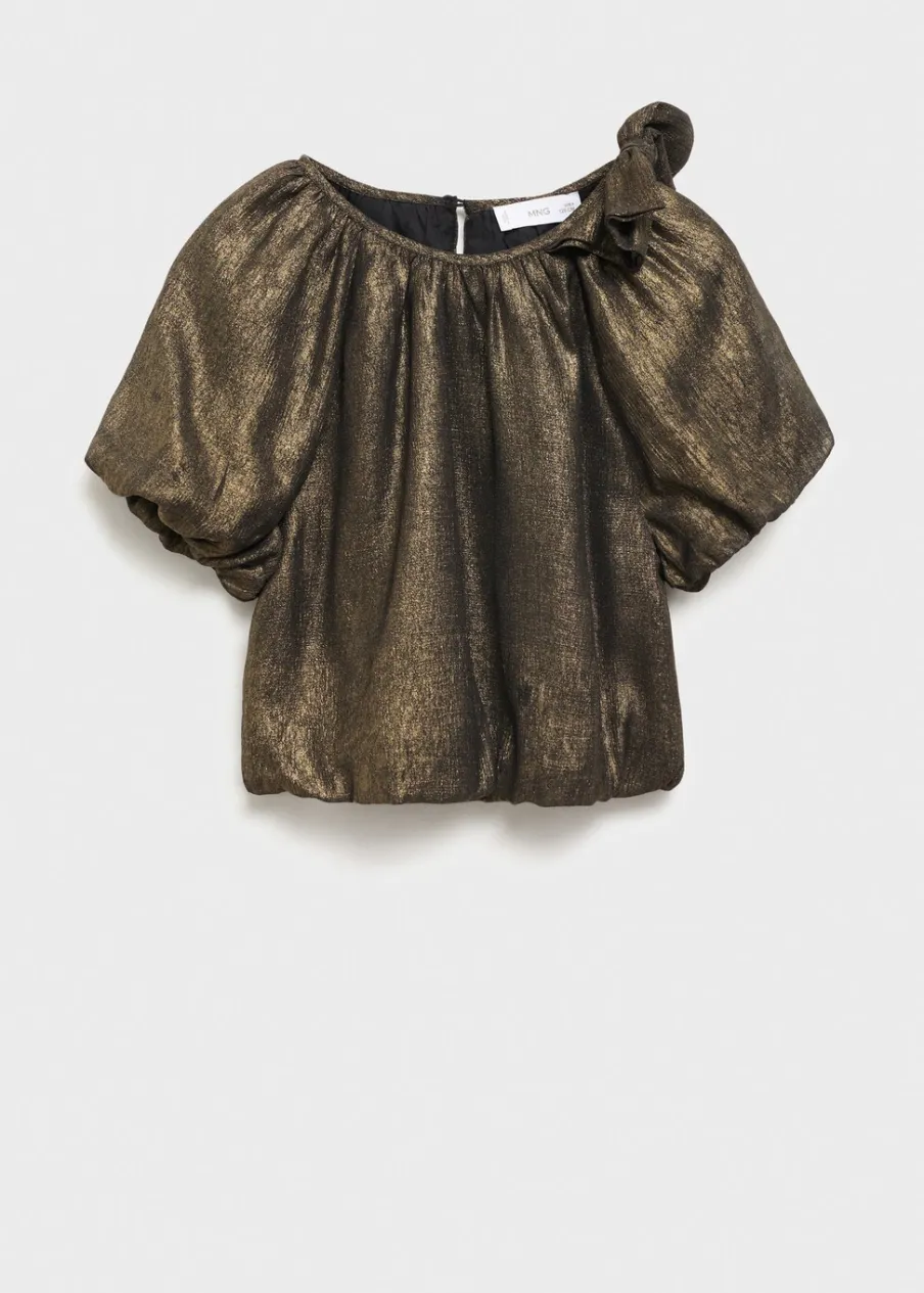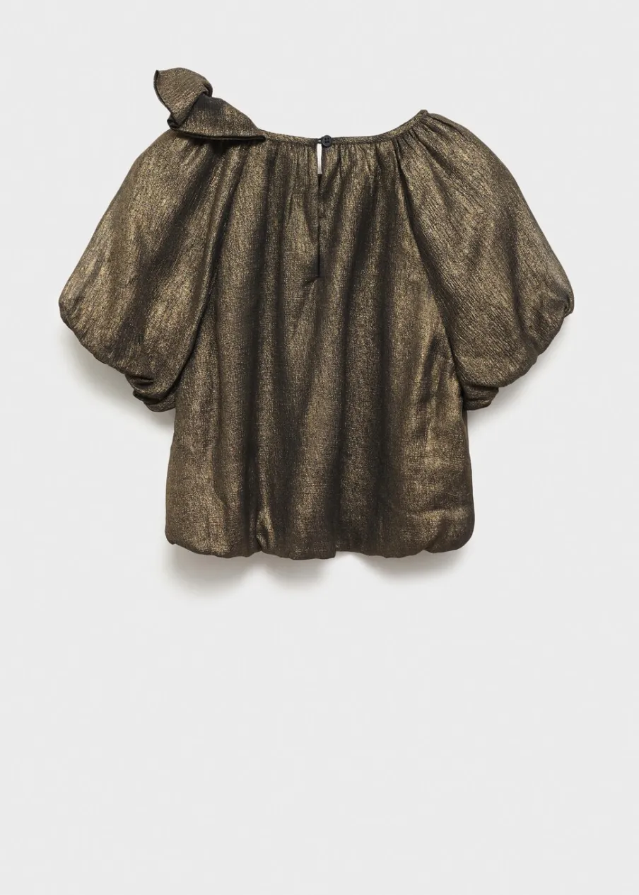 Okrągły dekolt. Model prosty. Krótki bufiasty rękaw. Rękawy z wiązaniami. Zapięcie na guzik. Party Collection.