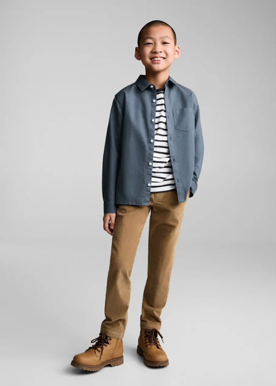100% bomull. Krój regular. Model prosty. Koszulowy kołnierz. Długi rękaw z guzikami na mankietach. Kieszeń nakładana. Zapięcie z tyłu na guziki.