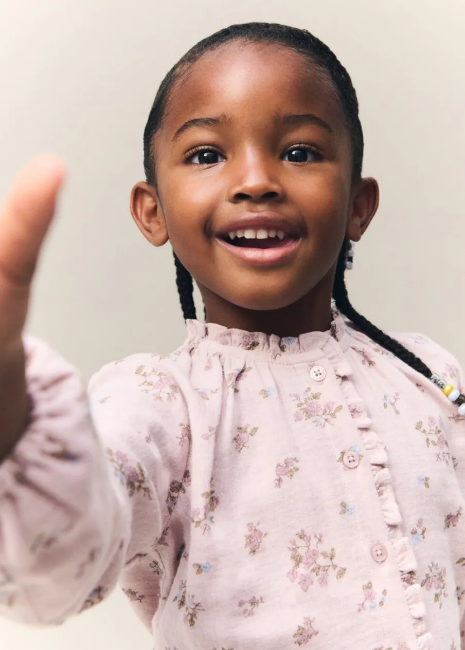 Bawełna 100%. Model prosty. Kwiatowy wzór. Okrągły dekolt. Długi rękaw. Z falbanami. Zapięcie na guziki z przodu.