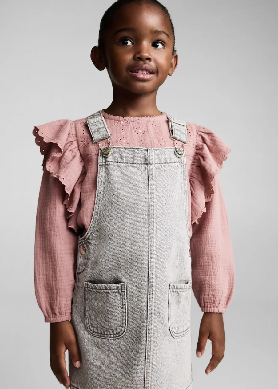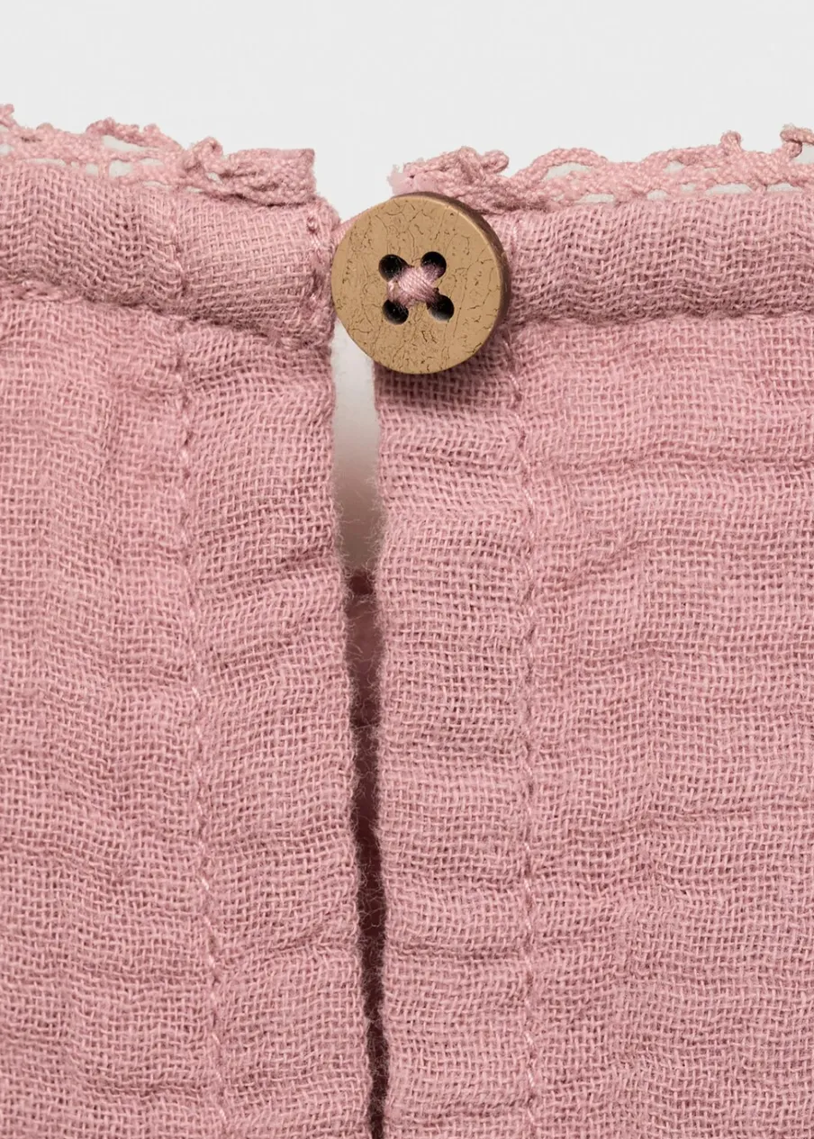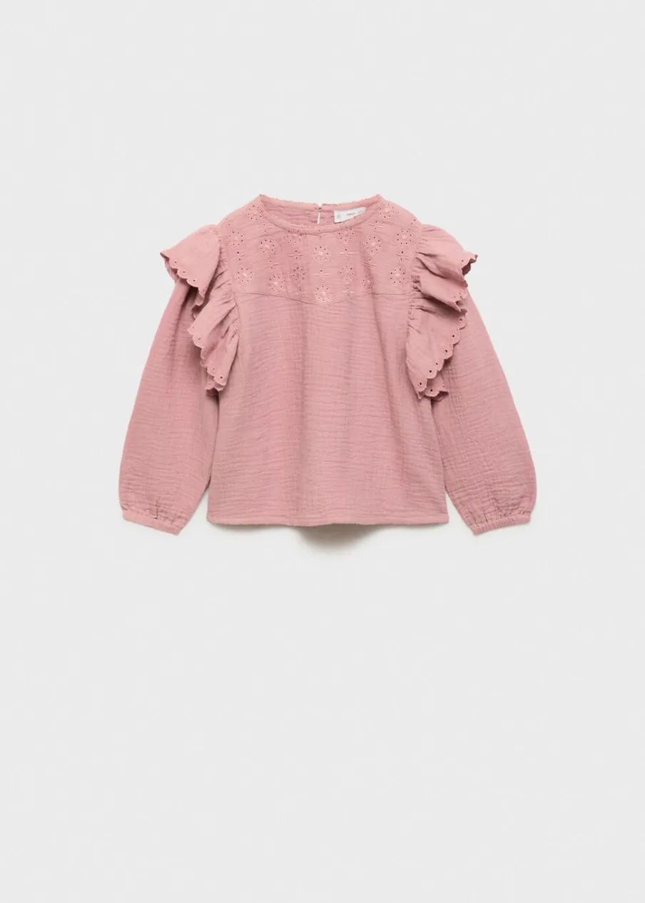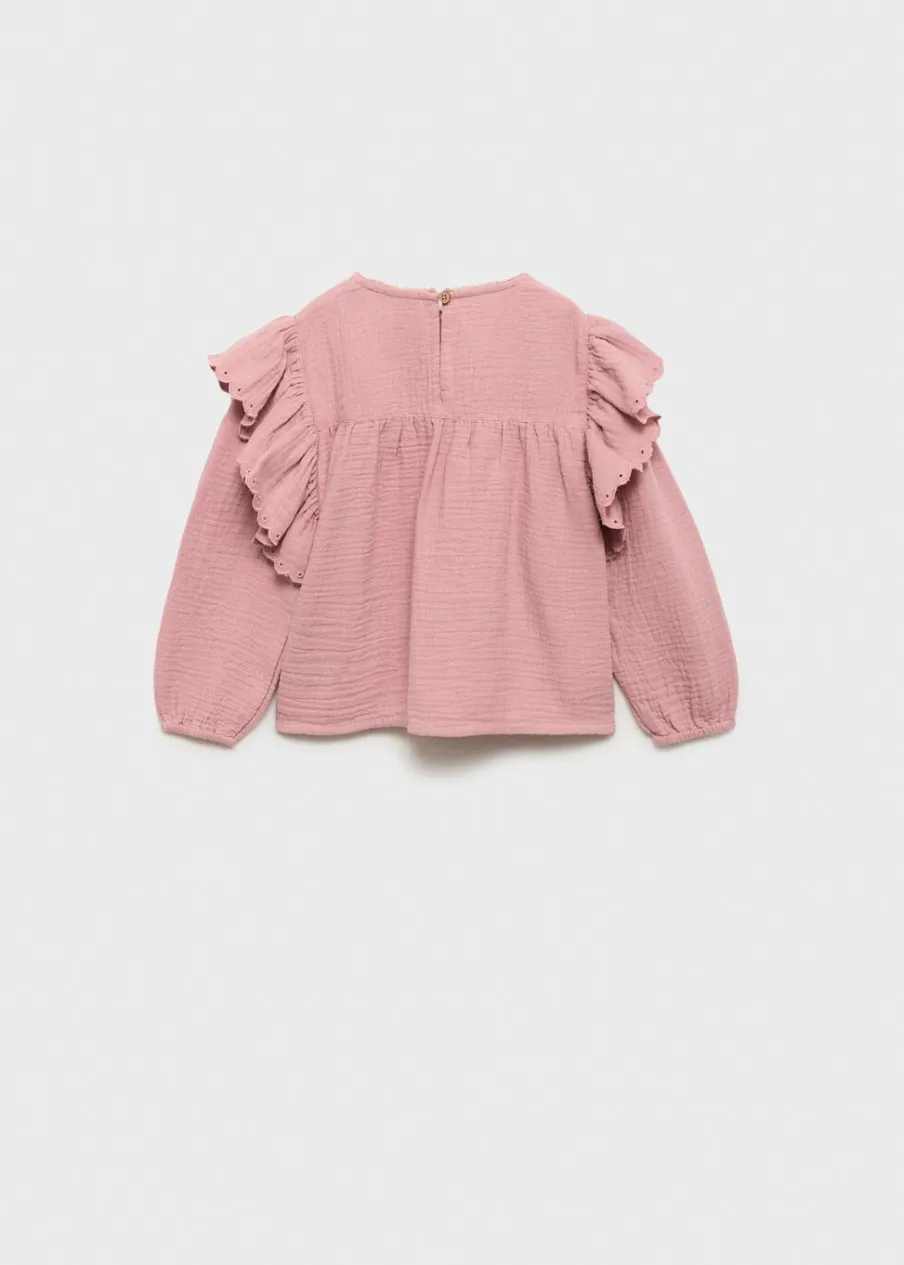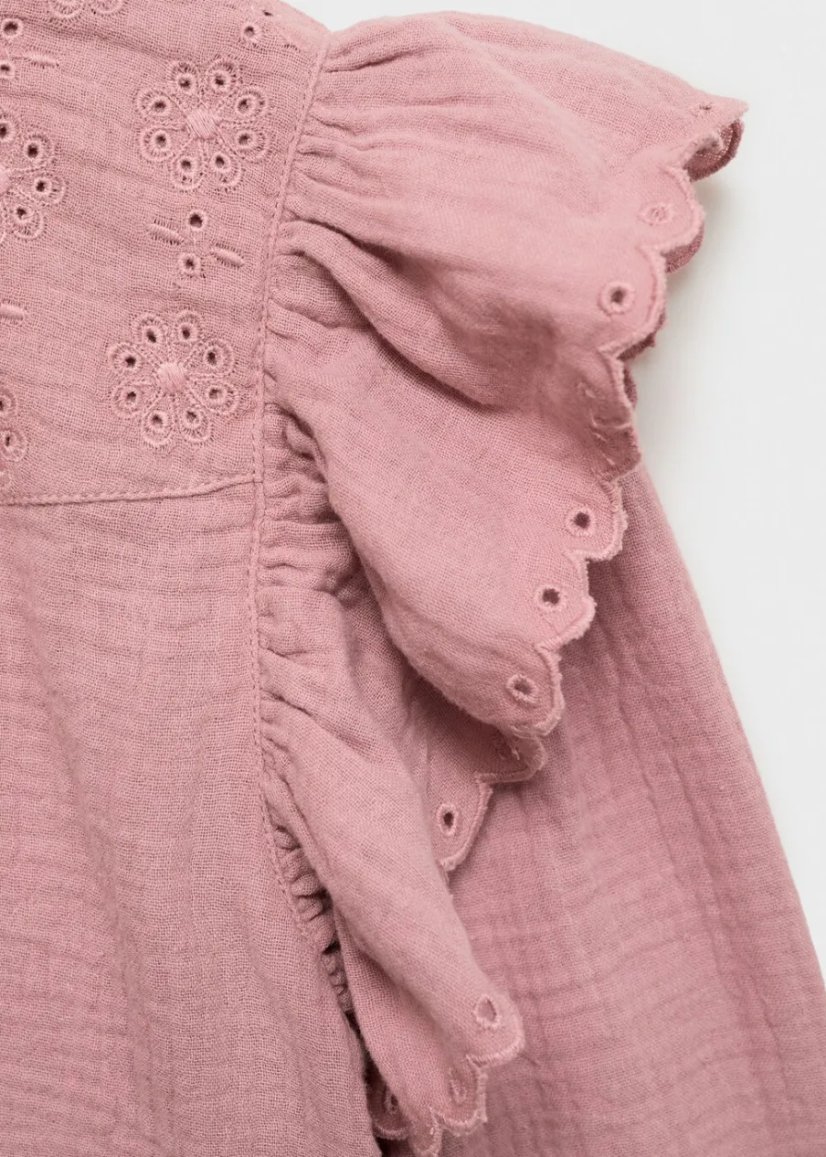 Bawełna 100%. Kreszowana tkanina. Tkanina z angielskim haftem. Falbanki na ramionach. Okrągły dekolt. Długi rękaw z elastycznymi marszczonymi mankietami. Zapięcie na guzik z tyłu.