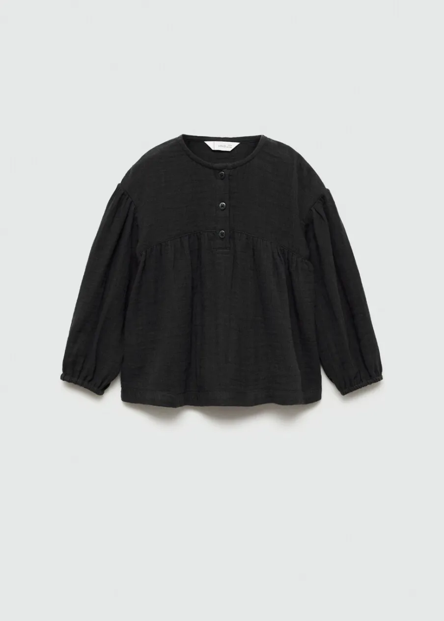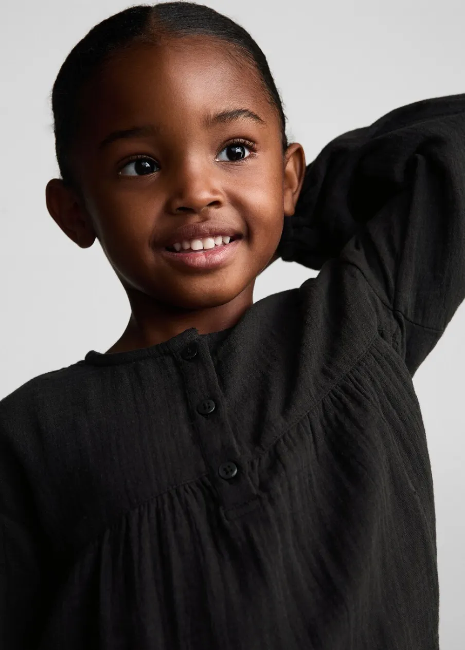 Powrót do szkoły. Bawełna 100%. Kreszowana tkanina. Model prosty. Okrągły dekolt. Zapięcie na guziki przy szyi. Długi bufiasty rękaw.