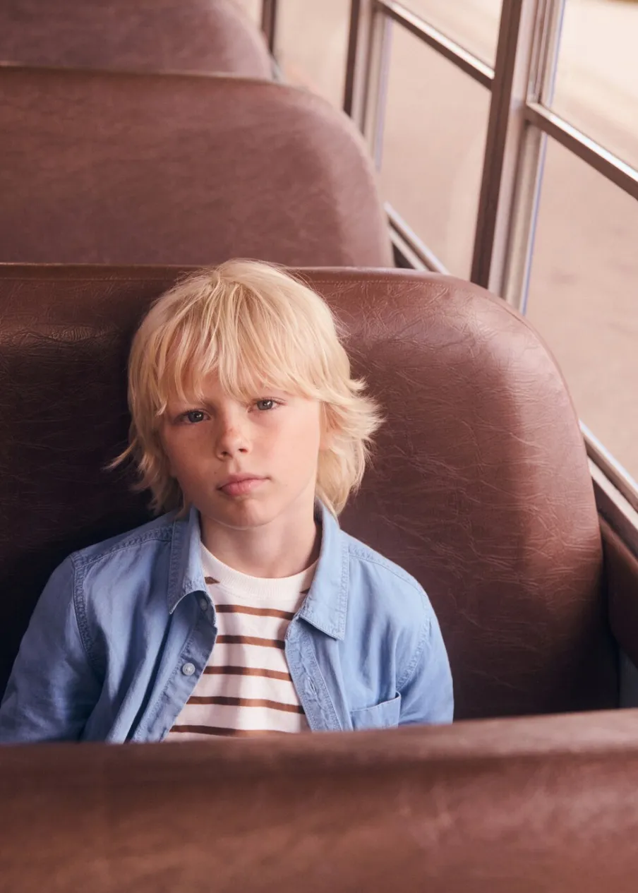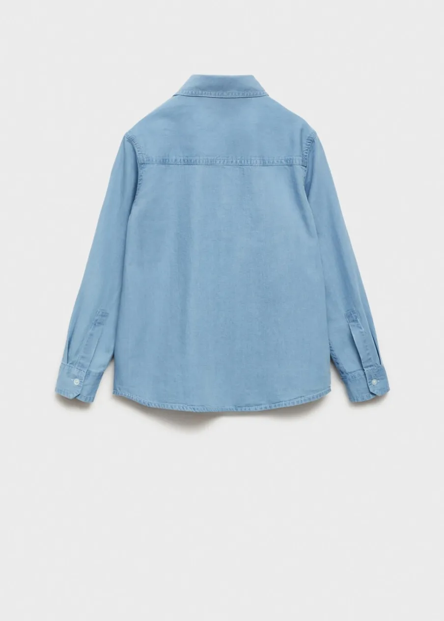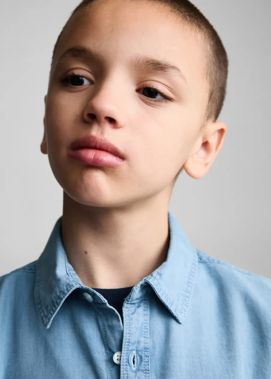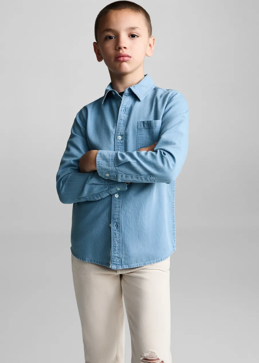 Kolekcja Powrót do szkoły. Krój regular. Koszulowy kołnierz. Długi rękaw z guzikami na mankietach. Tkanina bawełniana w dżinsowym stylu. Kieszeń nakładana na piersi. Zapięcie z przodu na guziki.