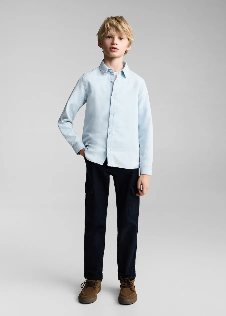 Tkanina bawełniana w dżinsowym stylu. Długi rękaw. Koszulowy kołnierz. Mankiety koszulowe na guziki. Rozcięcia u dołu. Zapięcie na guziki z przodu.