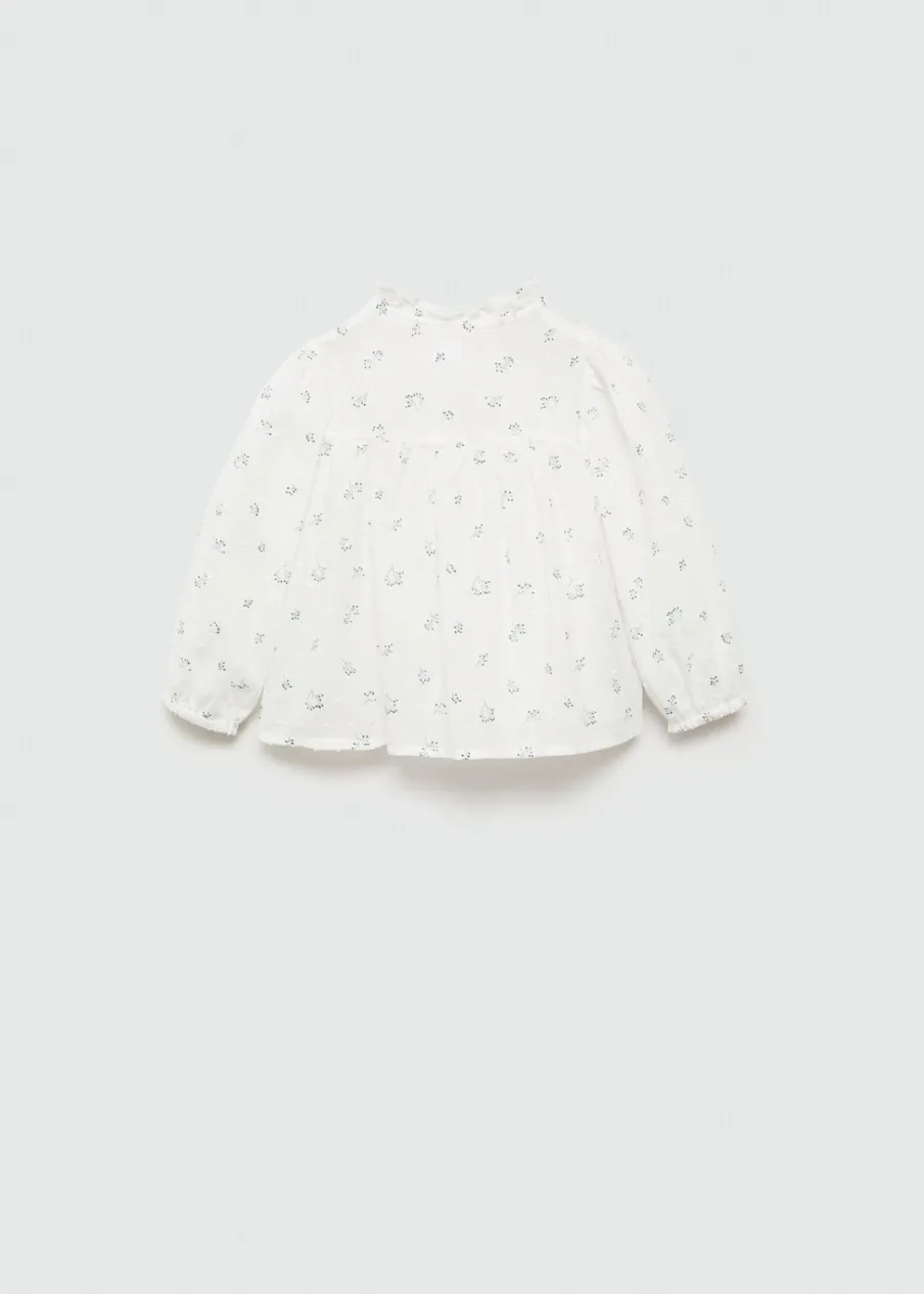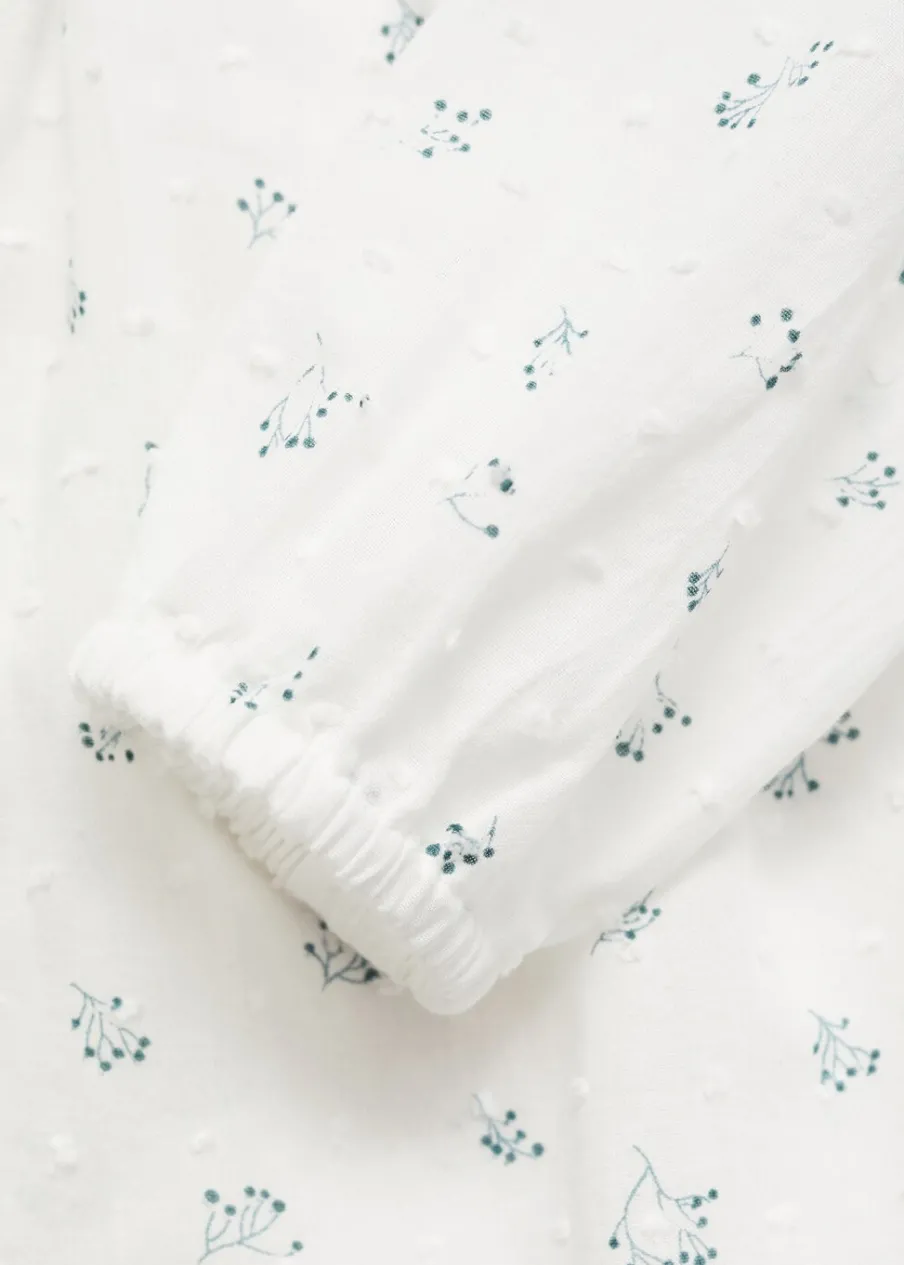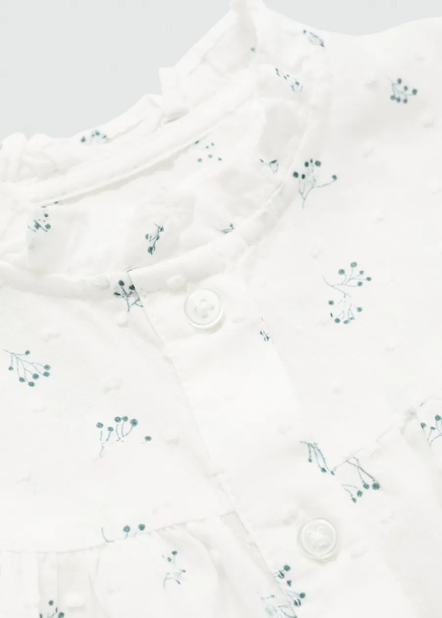 Bawełna 100%. Model prosty. Kwiatowy wzór. Falbanki pod szyją. Długi bufiasty rękaw. Zapięcie na guziki. Dostępny zestaw total look.