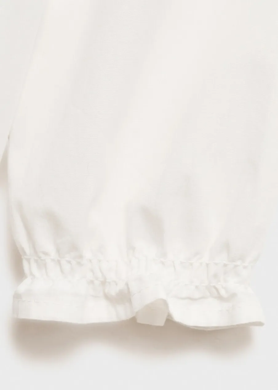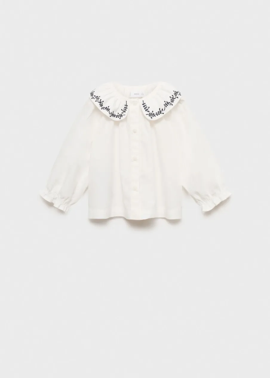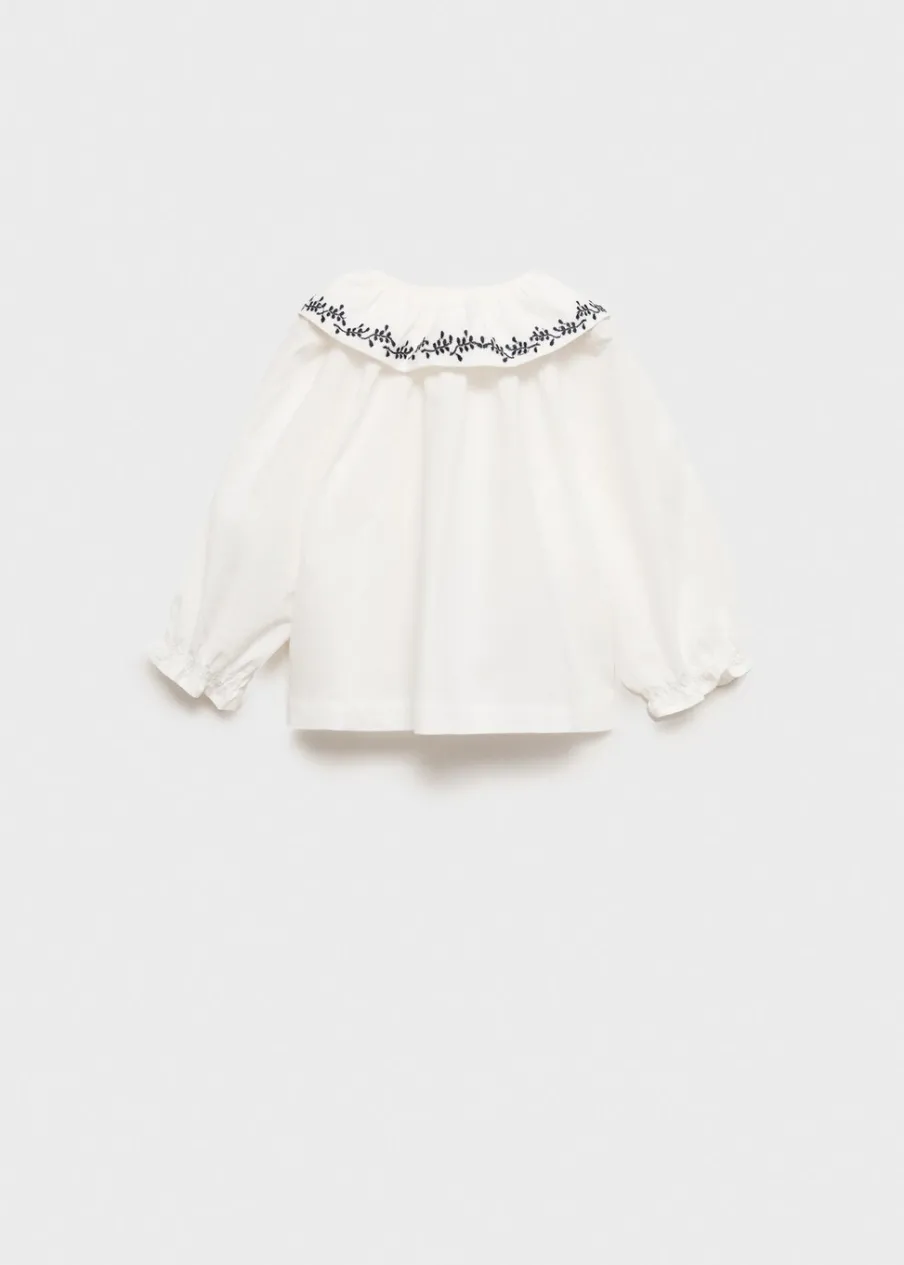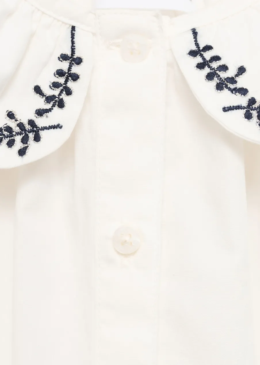 OpisModel prosty. Kołnierzyk bebe. Haftowane detale. Długi bufiasty rękaw. Zapięcie na guziki z przodu.