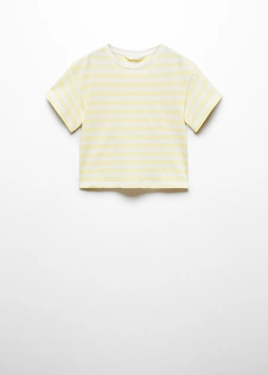 100% bomull. Model prosty. Wzór w pasy. Okrągły dekolt. Krótki rękaw. Obóz letni.