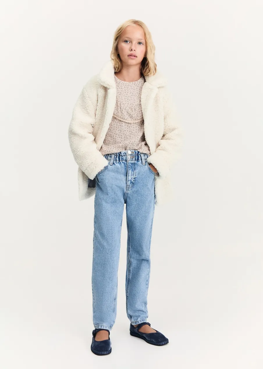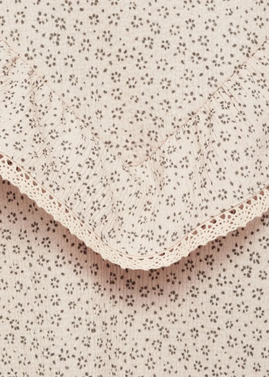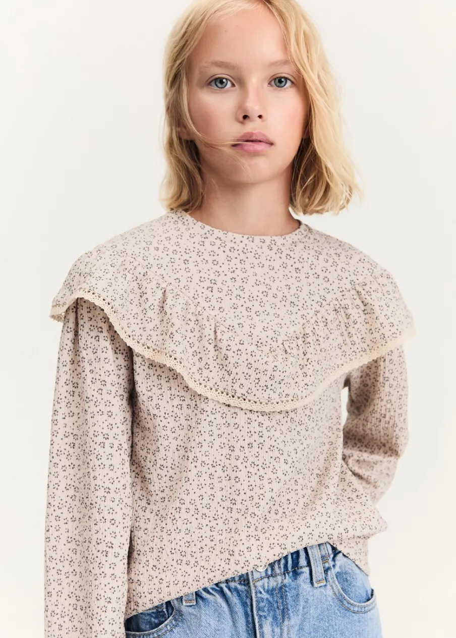 Kolekcja Powrót do szkoły. Model prosty. Długi rękaw. Detal z falbaną. Zapięcie na guzik z tyłu. Okrągły dekolt.
