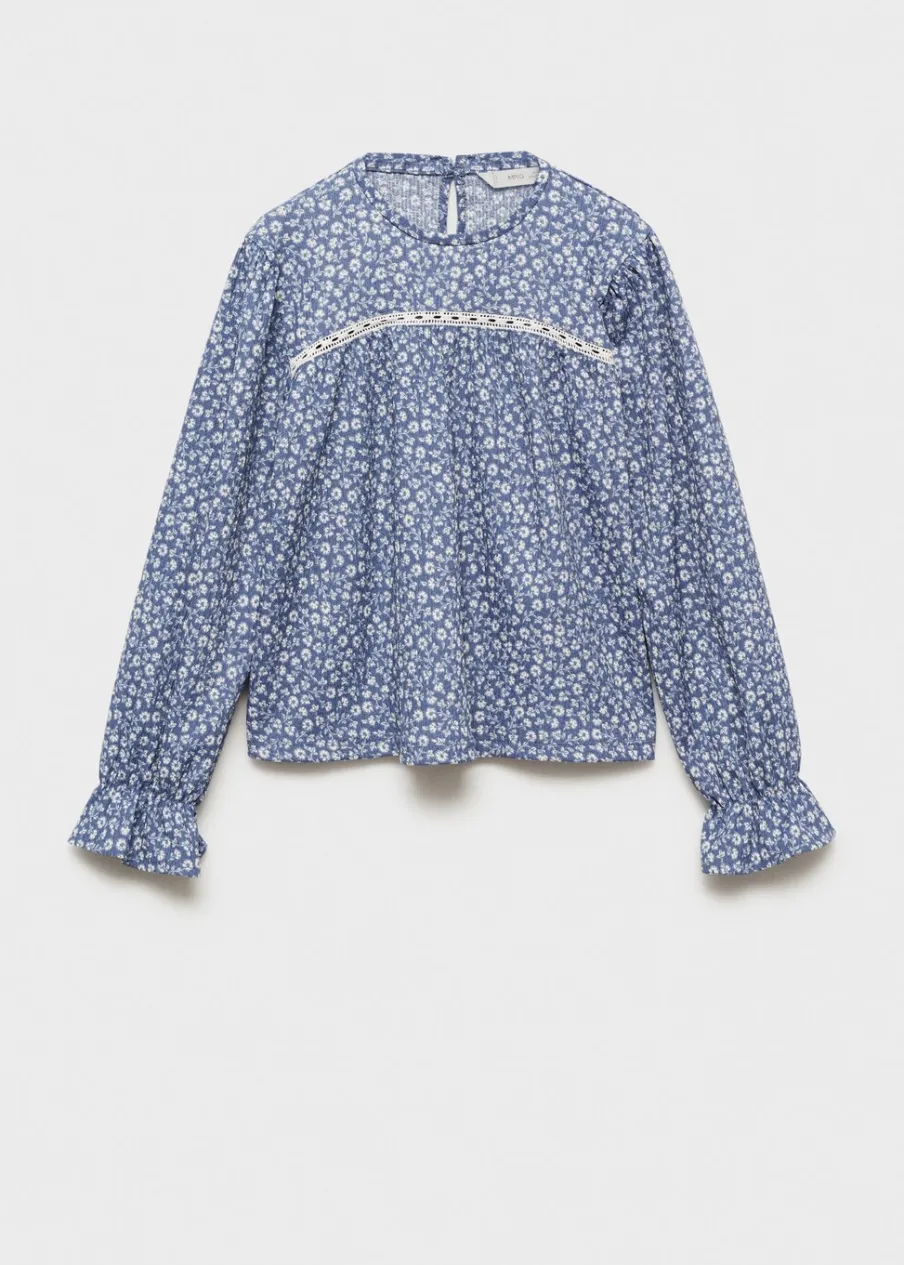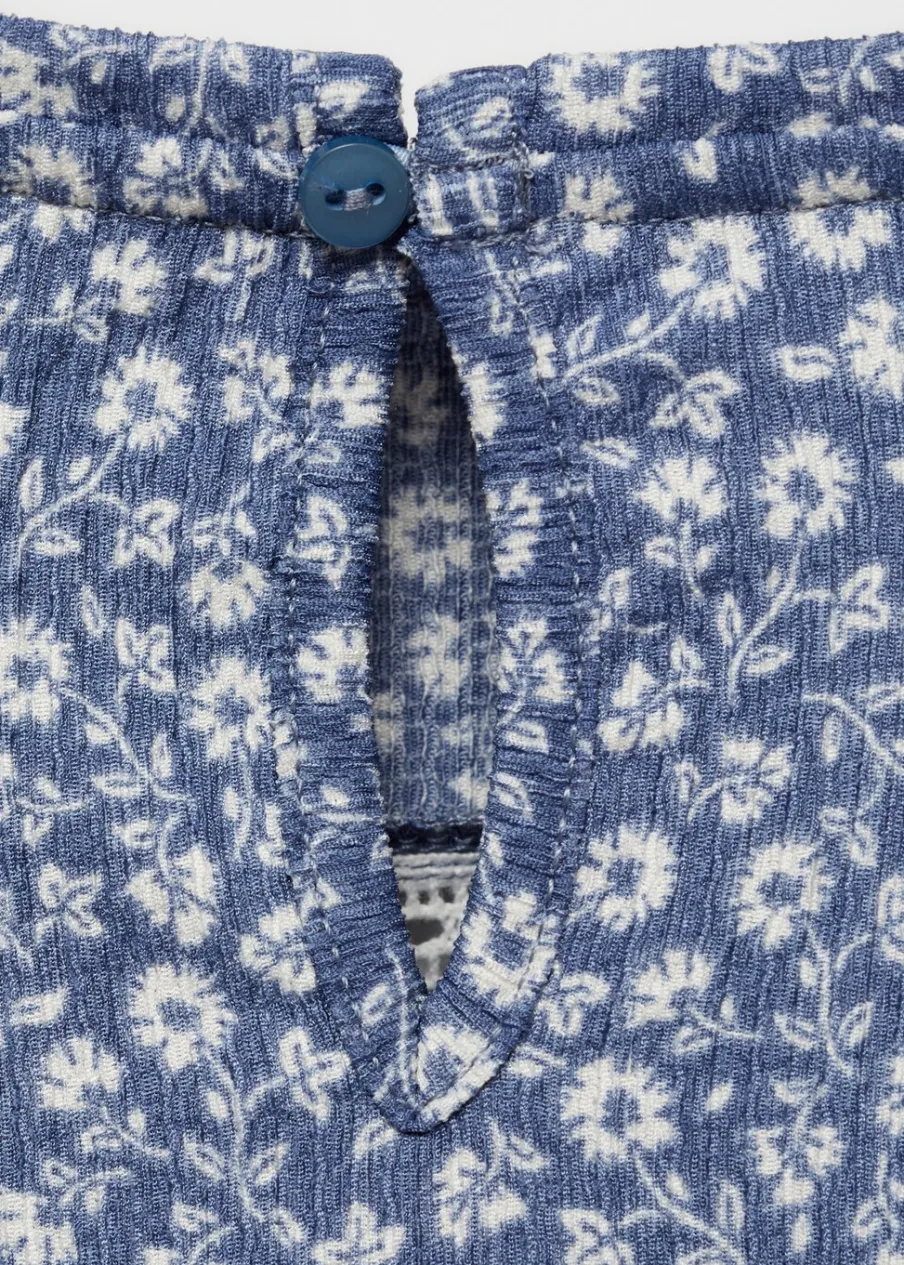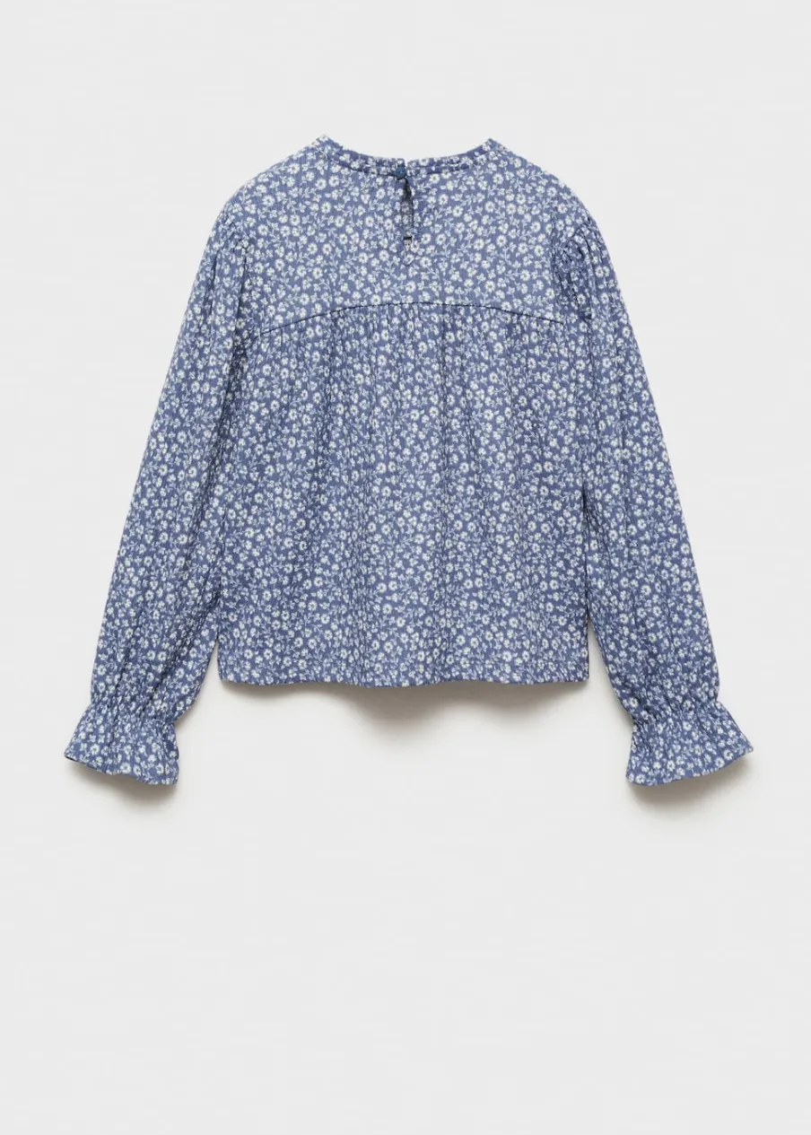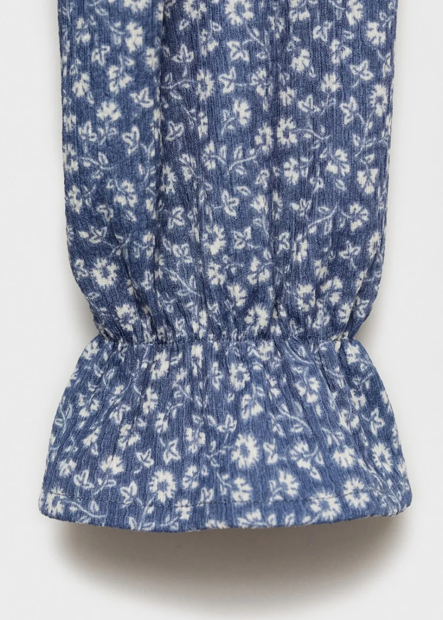 Kolekcja Powrót do szkoły. Model prosty. Kwiatowy deseń. Okrągły dekolt. Długi bufiasty rękaw. Zapięcie na guzik z tyłu. Haftowany detal.