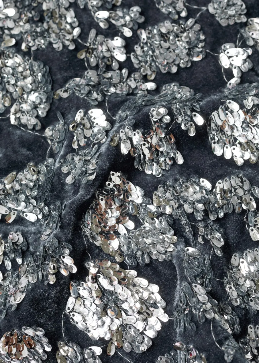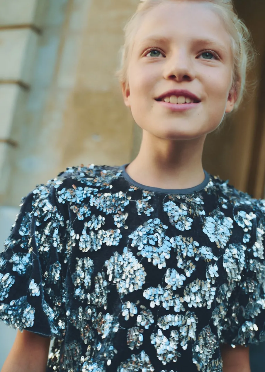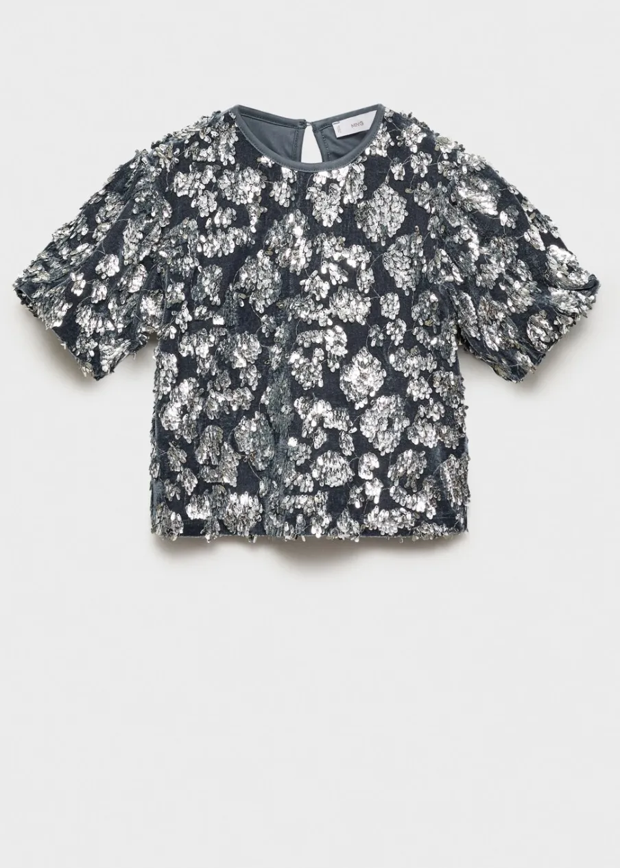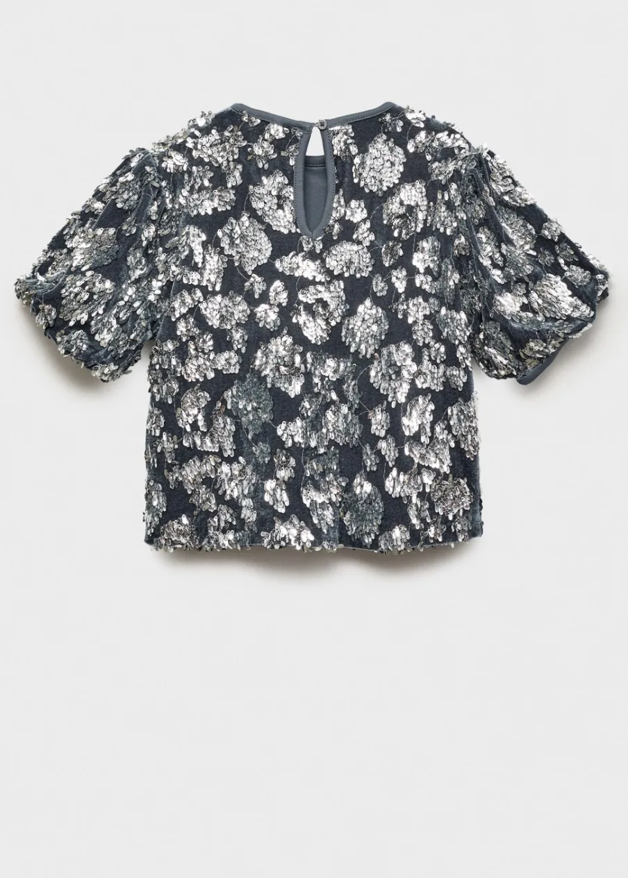 Z ozdobnymi cekinami. Okrągły dekolt. Model prosty. Deseń crop. Krótki rękaw. Zapięcie na guzik. Total look. Wewnętrzna podszewka. Kolekcja wieczorowa i imprezowa.