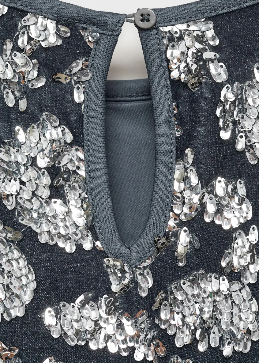 Dekoratív flitterekkel, kerek nyakkivágás, egyenes kialakítás, vágott fazon, rövid ujj, gombos rögzítés, total look, belső bélés.