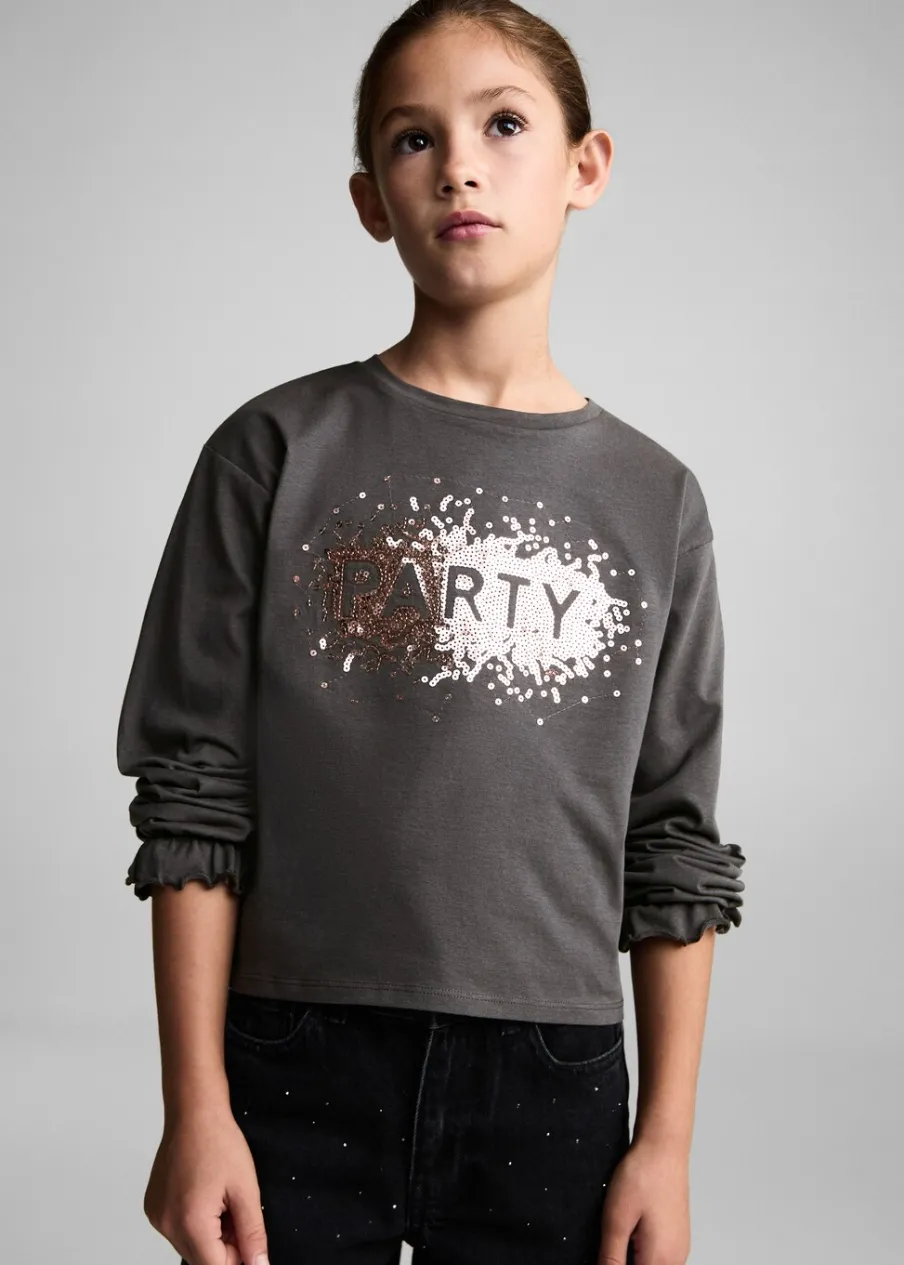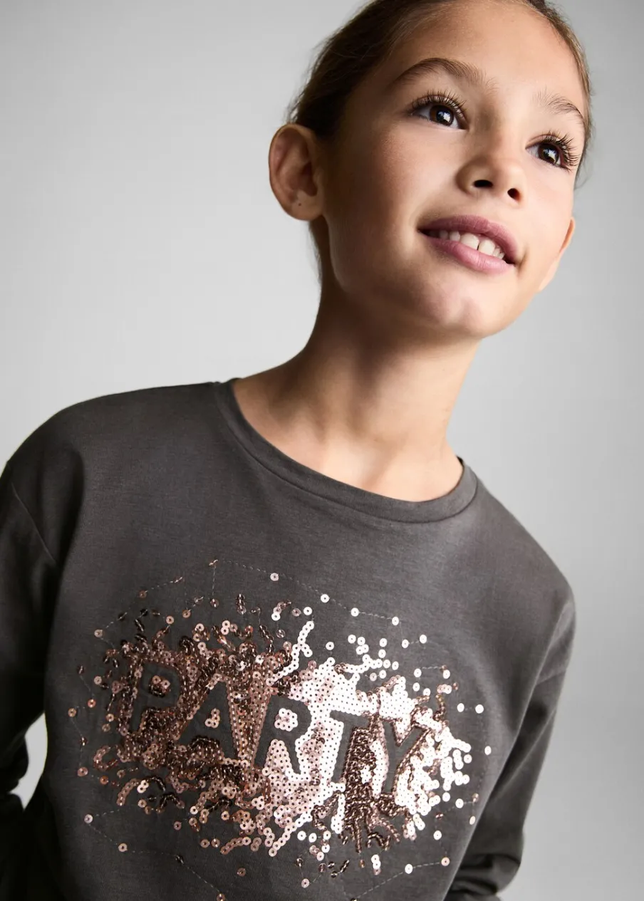 OpisBawełna 100%. Cekinowa ozdoba. Model prosty. Okrągły dekolt. Długi rękaw z elastycznymi marszczonymi mankietami…