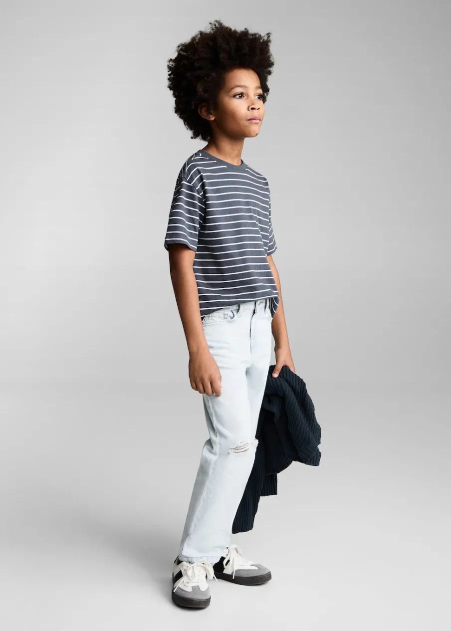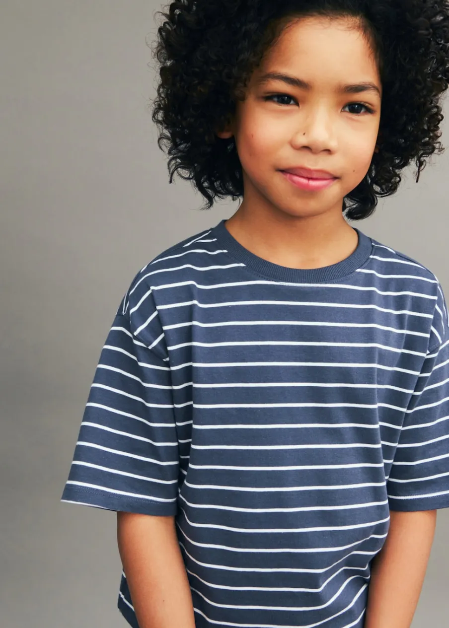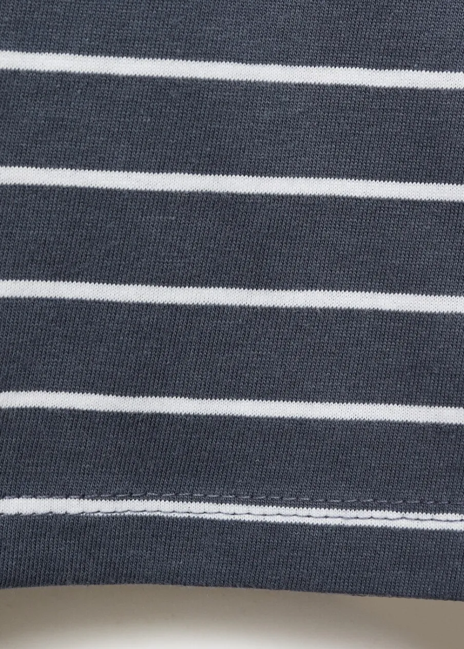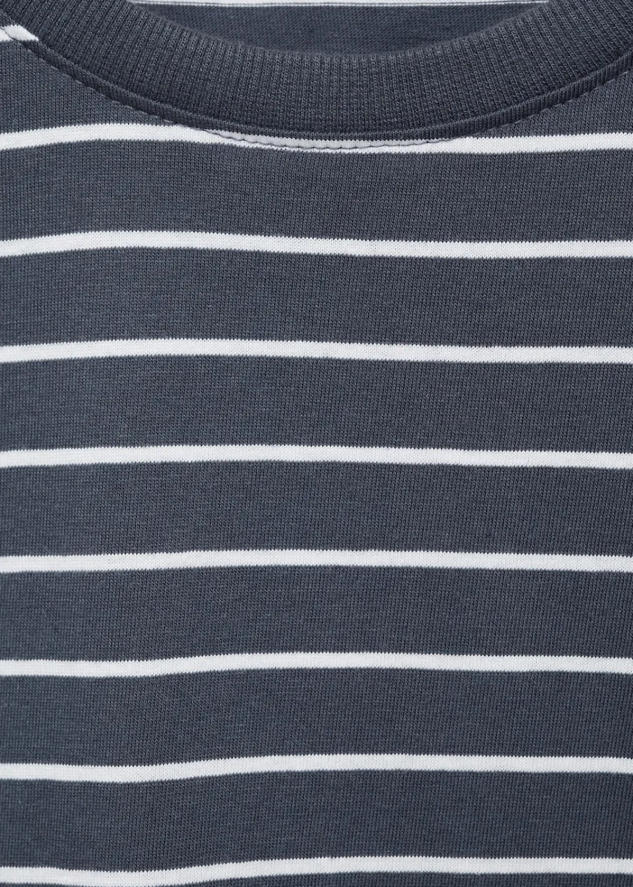 Tkanina z 100% bawełny. Dzianina. Deseń w pasy. Model prosty. Okrągły dekolt. Krótki rękaw.