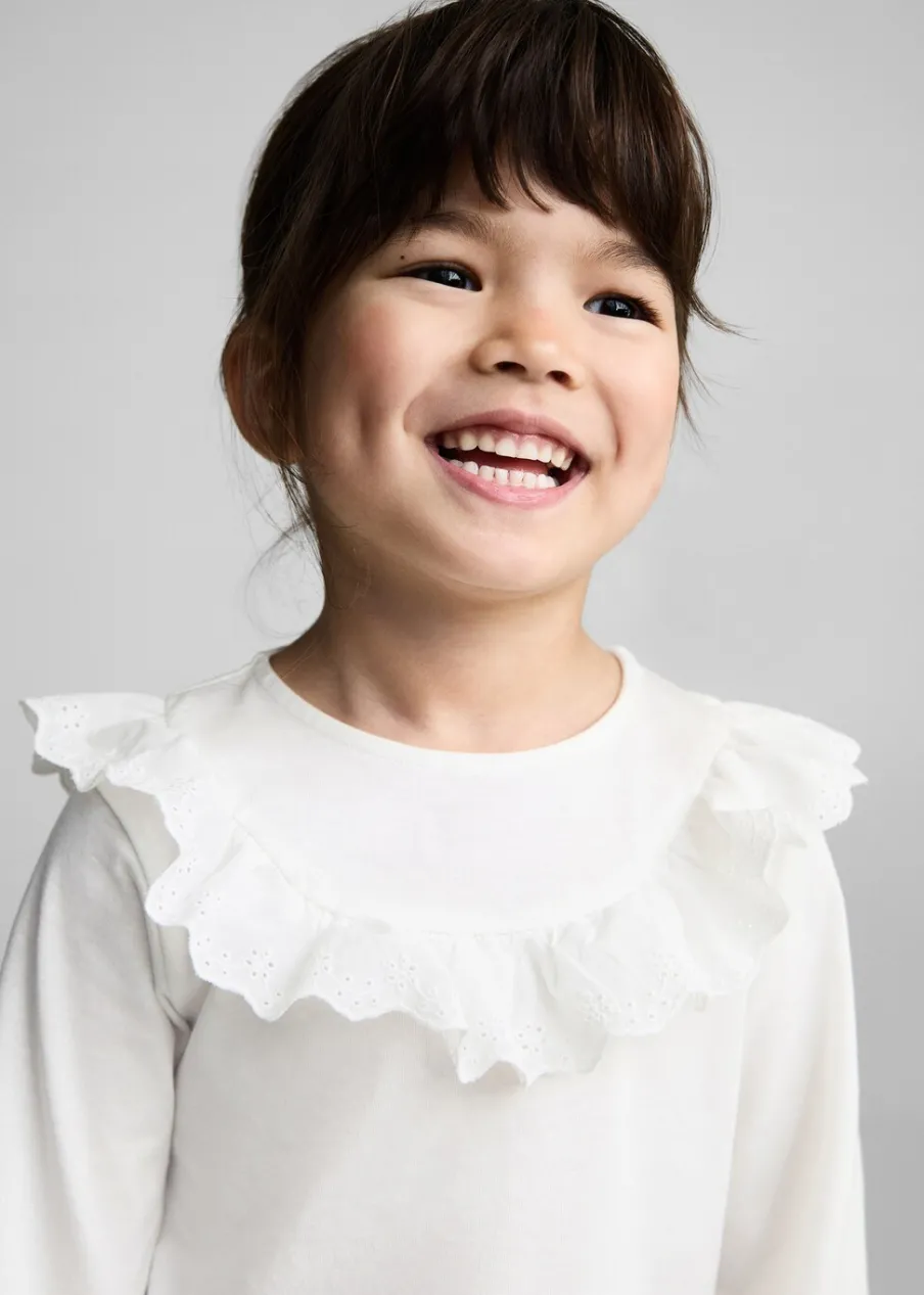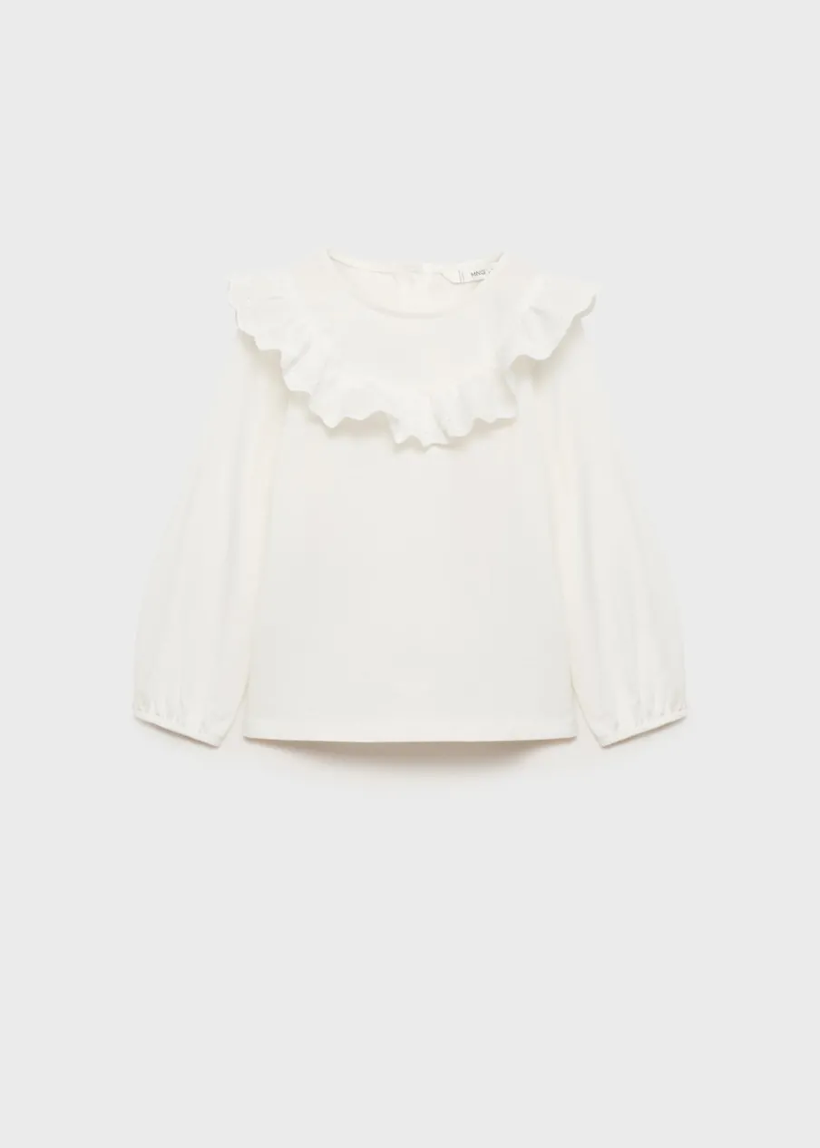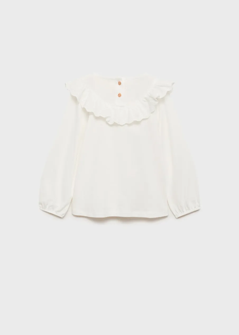 Bawełna 100%. Model prosty. Okrągły dekolt. Detal z falbaną. Zapięcie na guziki na plecach. Guziki z imitacji drewna. Marszczone mankiety. Długi rękaw.