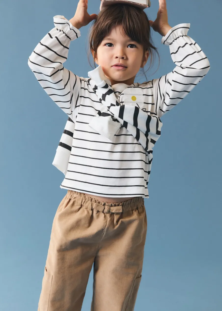 Model prosty. Okrągły dekolt. Długi bufiasty rękaw. Bawełna 100%. Wzór w paski. Haftowany detal.
