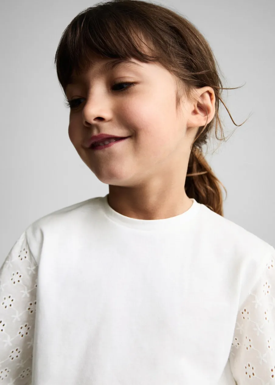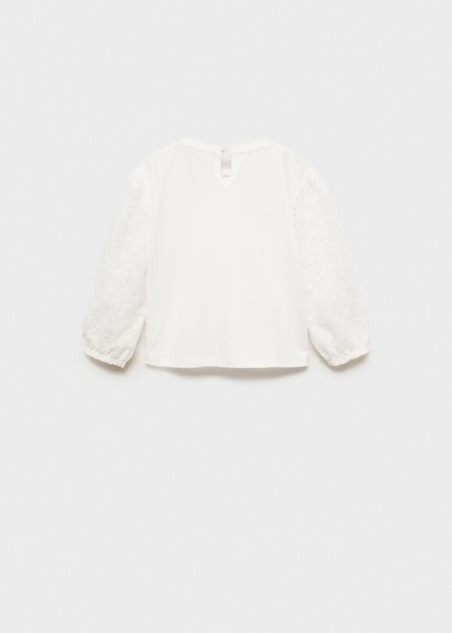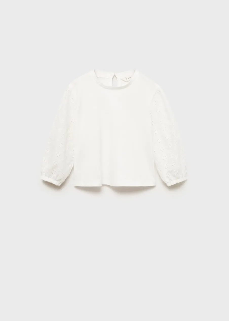 Bawełna 100%. Długi rękaw ze szczypankami. Tkanina z angielskim haftem. Okrągły dekolt. Mankiet z gumką. Zapięcie na guzik pod szyją.