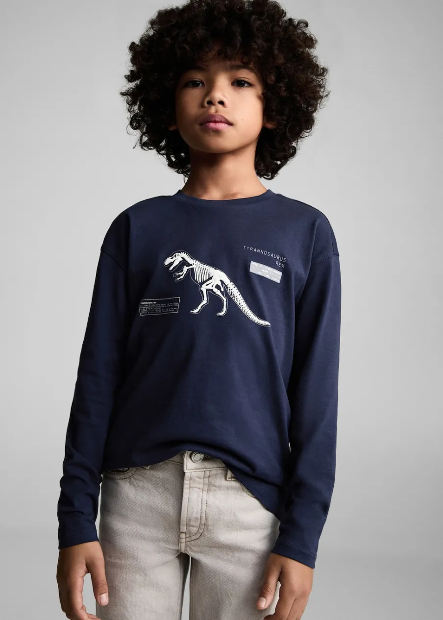 Tkanina z bawełną. Nadruk dinozaura. Model prosty. Okrągły dekolt. Długi rękaw.