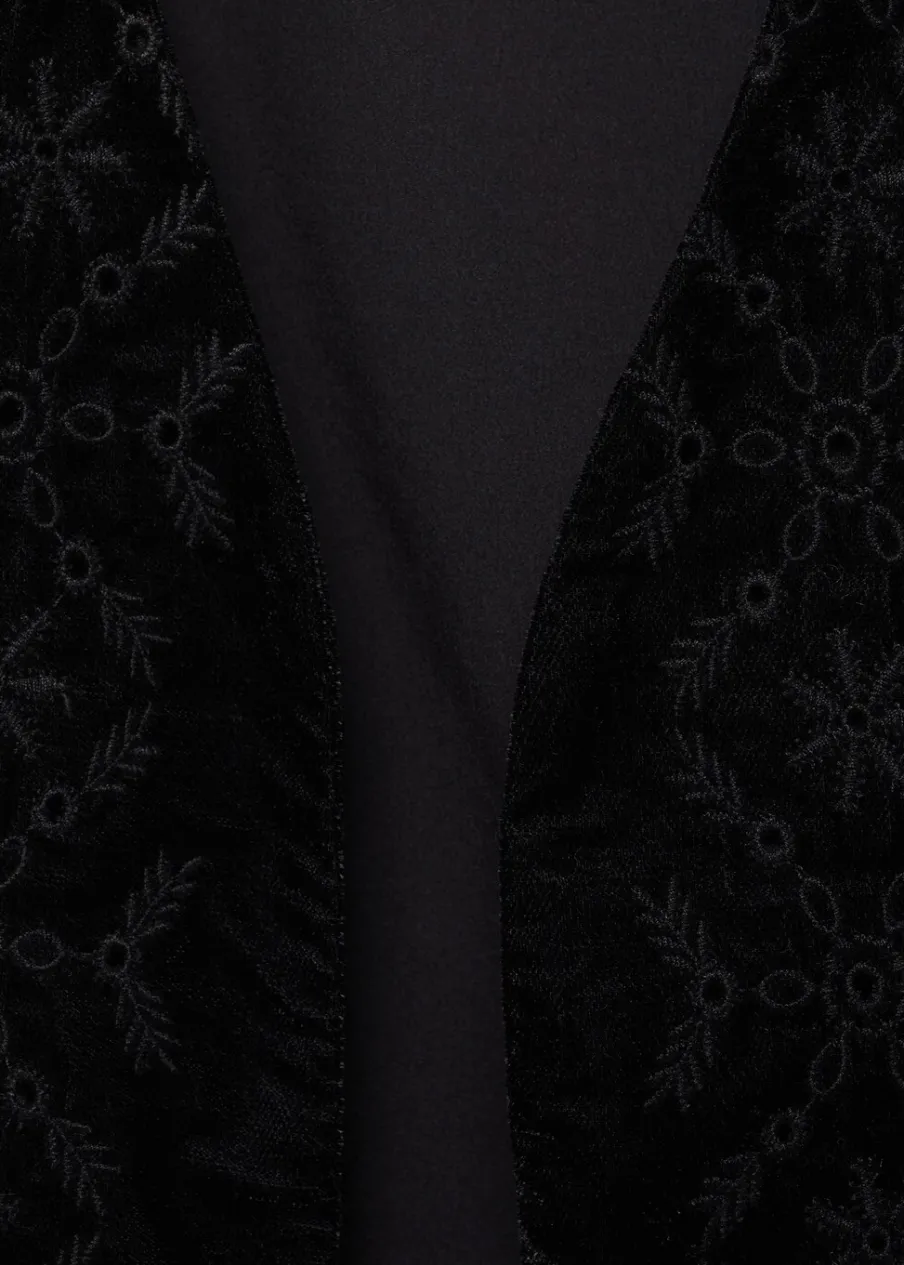 Tkanina z bawełną. Aksamitna tkanina. Bez rękawów. Model prosty. Dekolt V. Deseń crop. Haftowane detale. Kolekcja wieczorowa i imprezowa.