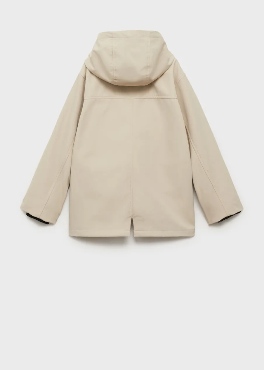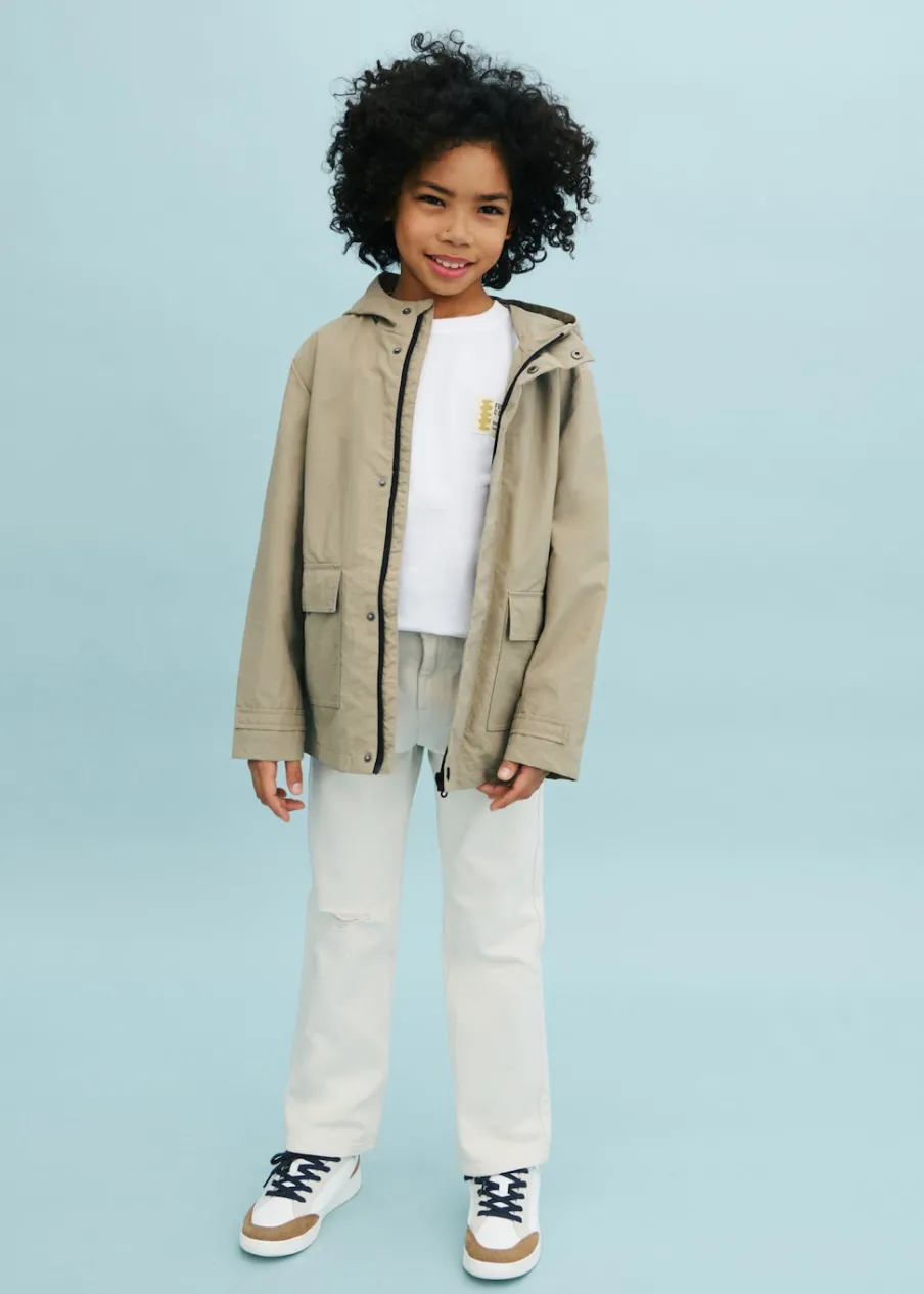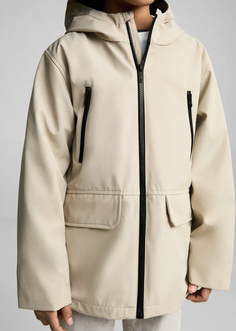 Nieprzemakalny materiał. Kaptur. Dwie kieszenie zapinane na suwak. Dwie kieszenie z patką. Długi rękaw. Wewnętrzna podszewka. Zapięcie na zamek z przodu.