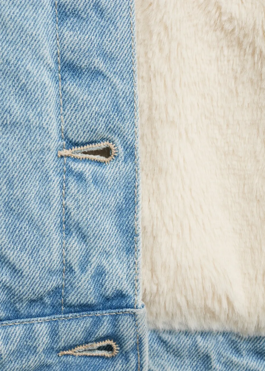 Tkanina bawełniana w dżinsowym stylu. Model prosty. Futrzany kołnierz. Polarowa podszewka. Długi rękaw z guzikami na mankietach. Cztery kieszenie. Zapięcie na guziki.