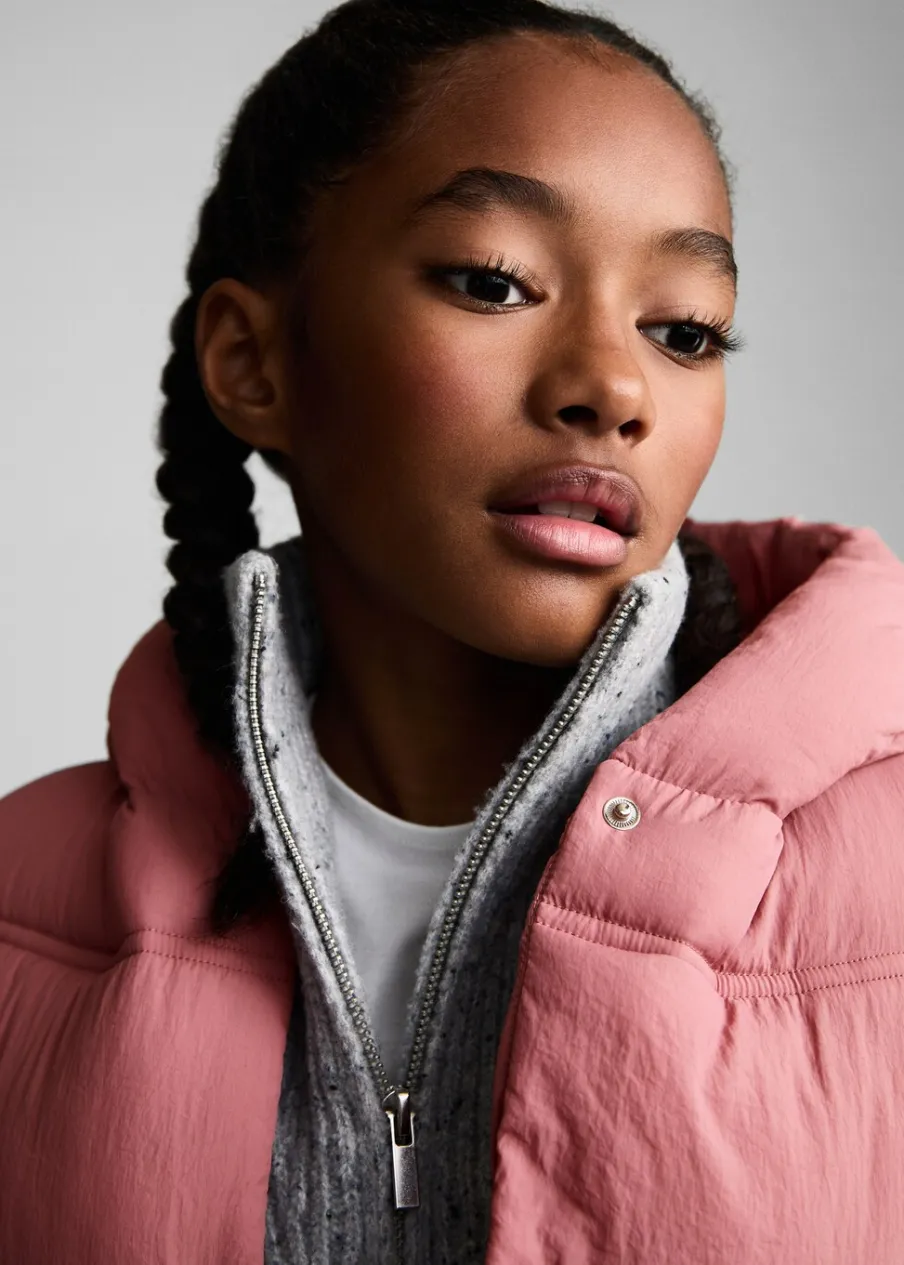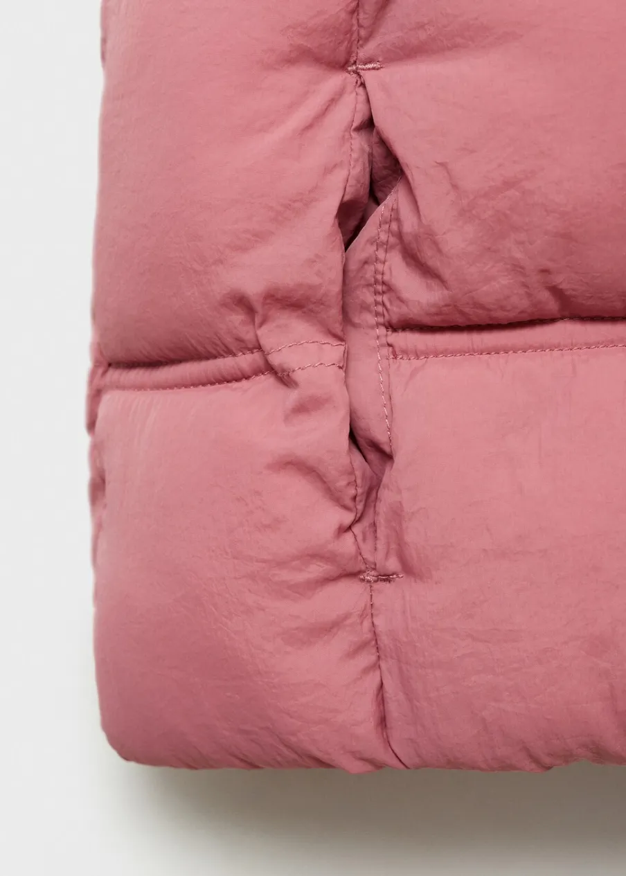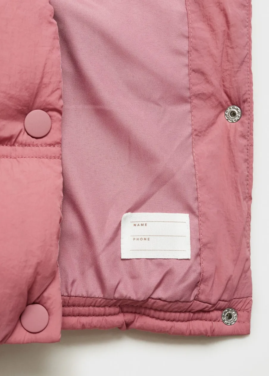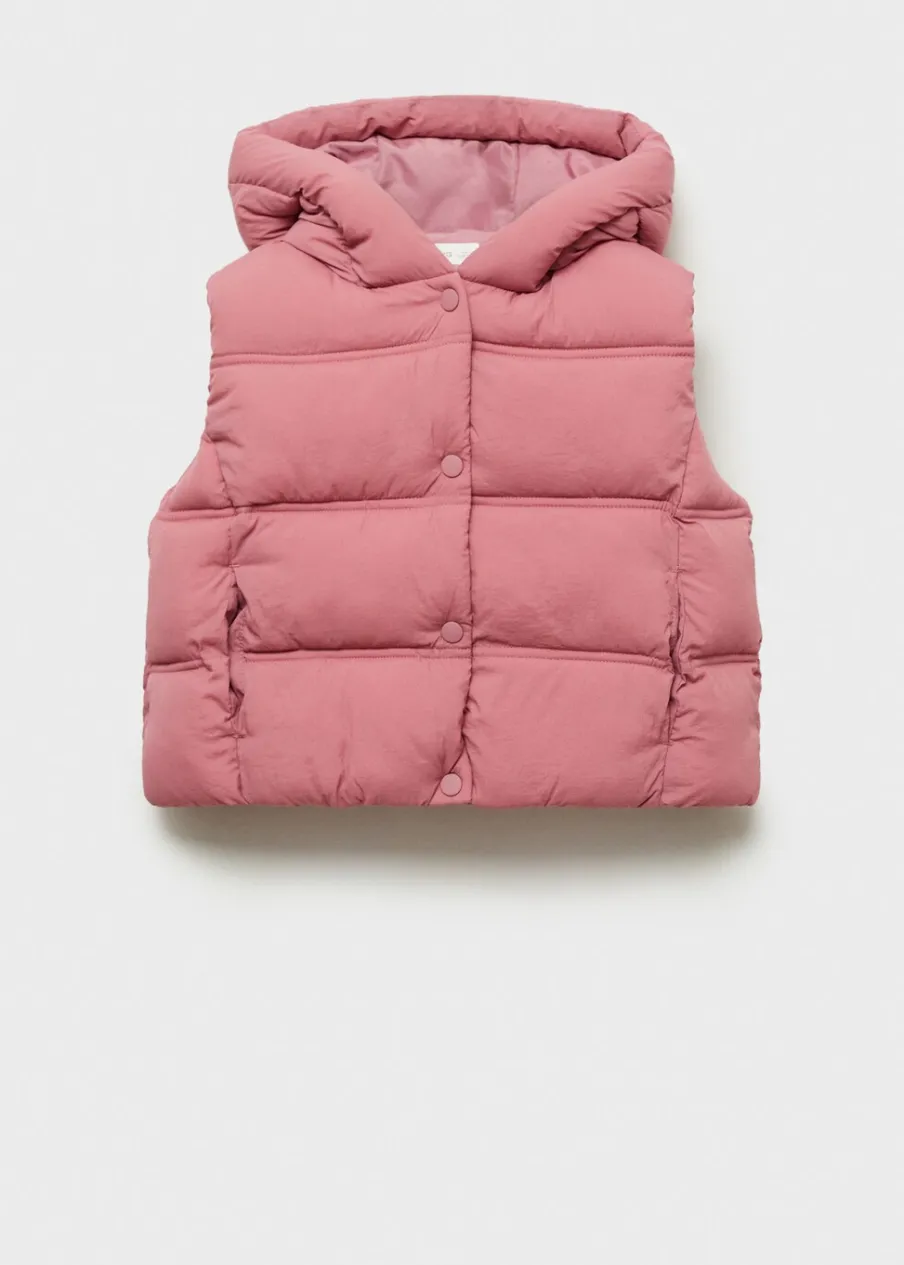 Model pikowany. Krótki krój. Kaptur. Bez rękawów. Dwie kieszenie boczne. Etykieta na dane kontaktowe. Zapięcie na zatrzaskowe guziki.