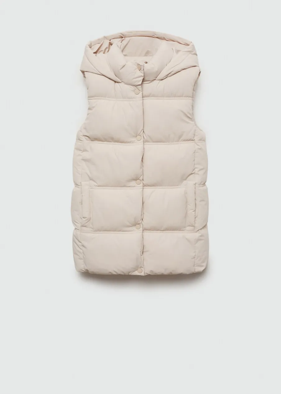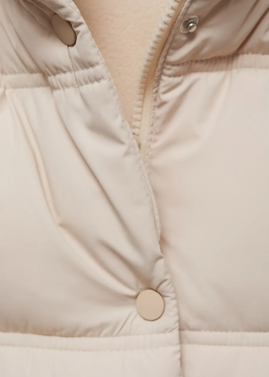 Model długi. Model prosty. Model pikowany. Cienka tkanina. Kaptur. Bez rękawów. Dwie kieszenie. Zapięcie na suwak i guziki.