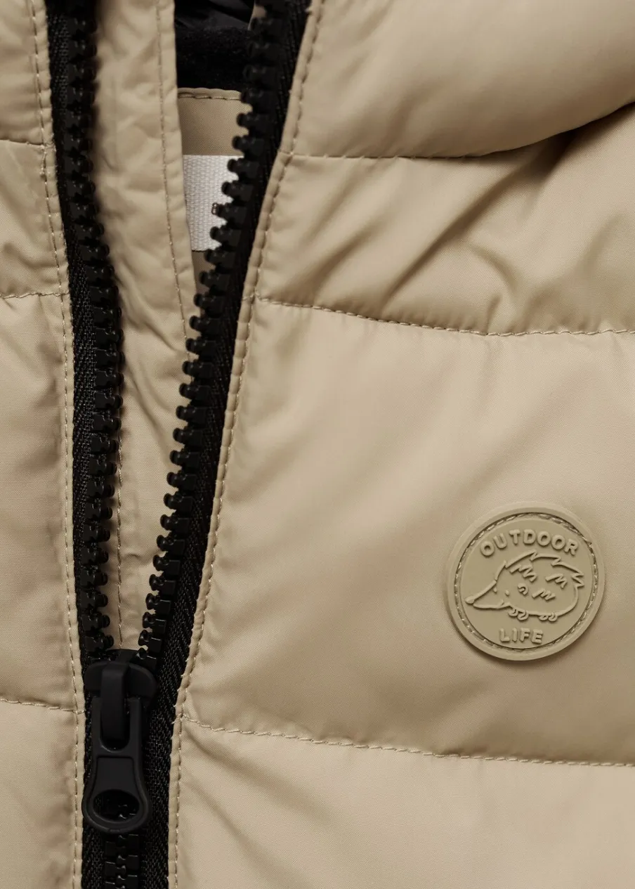 Model pikowany. Model prosty. Golf. Kaptur. Dwie kieszenie. Bez rękawów.